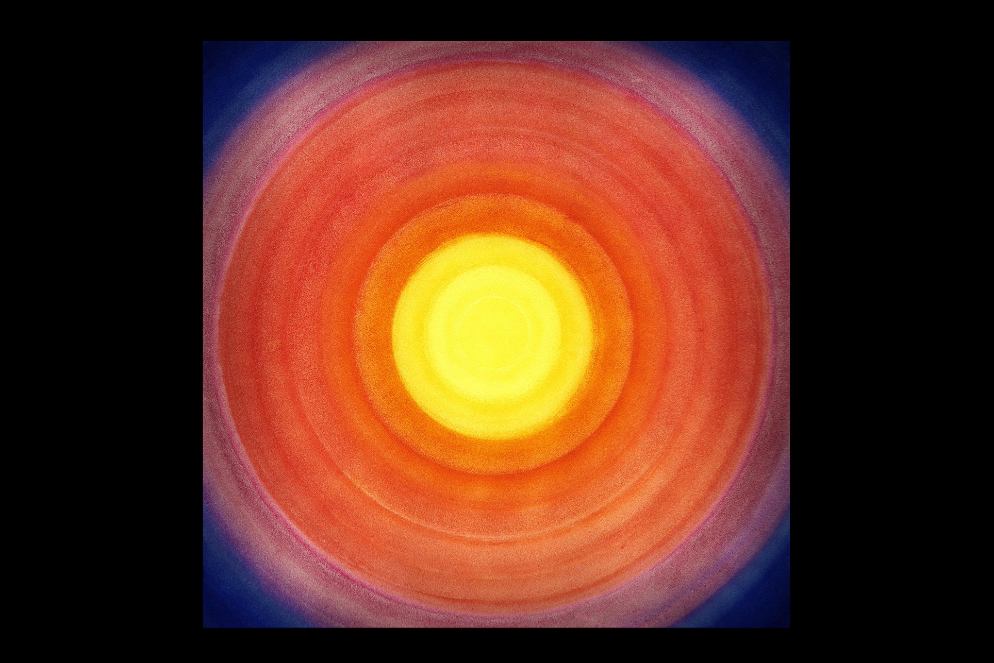 Tableau lumineux inspiré de l'arc-en-ciel. Grand cercle bleu, rouge, orange et jaune (de l'extérieur au centre).