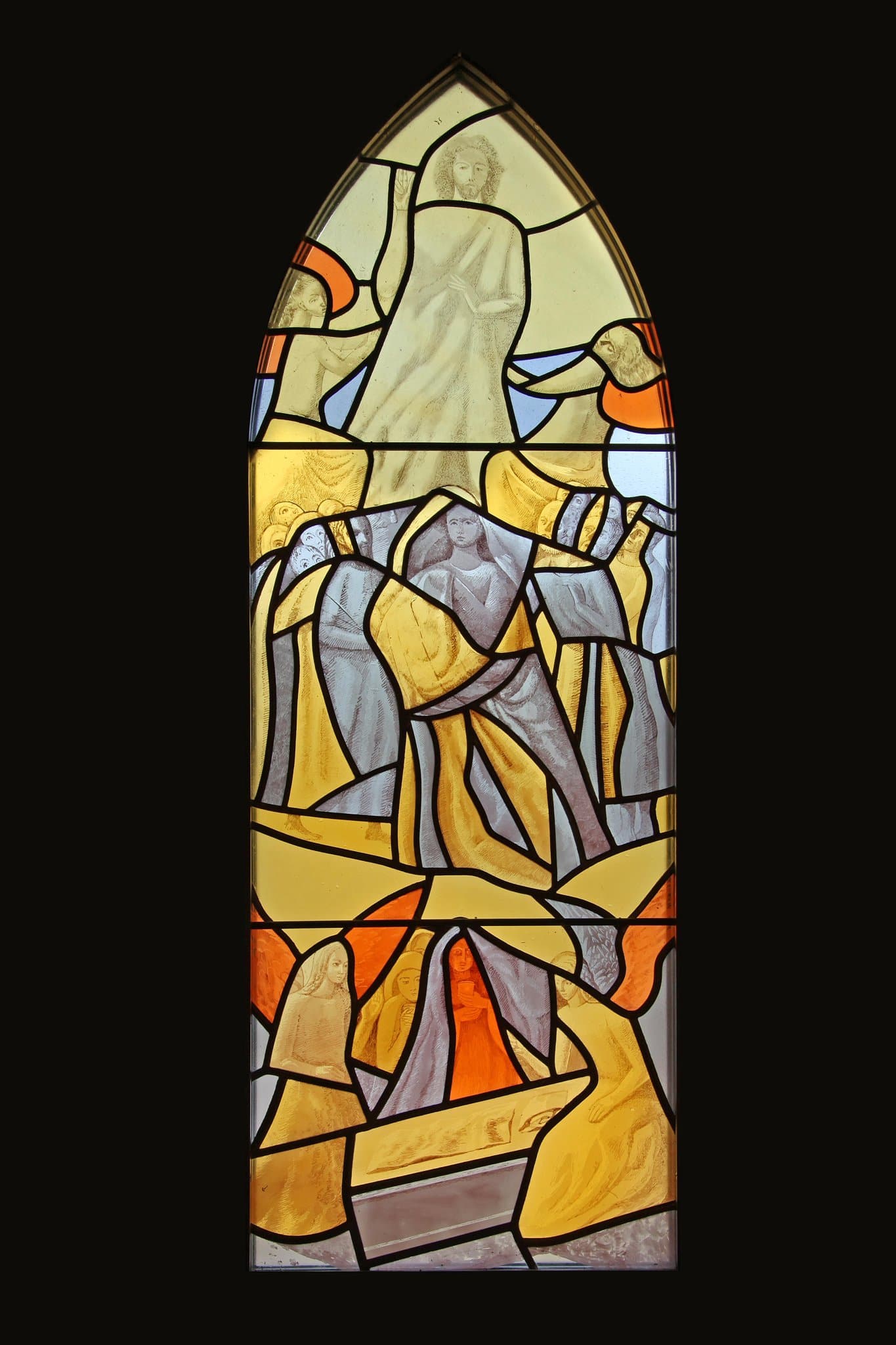 En bas, un ange, assis sur le tombeau du Christ vide, s’adresse aux femmes venues oindre le corps du Christ. Au gauche, un deuxième ange debout le regarde. En haut, le Christ entouré de deux anges s’élève dans le ciel alors que les apôtres le regardent.