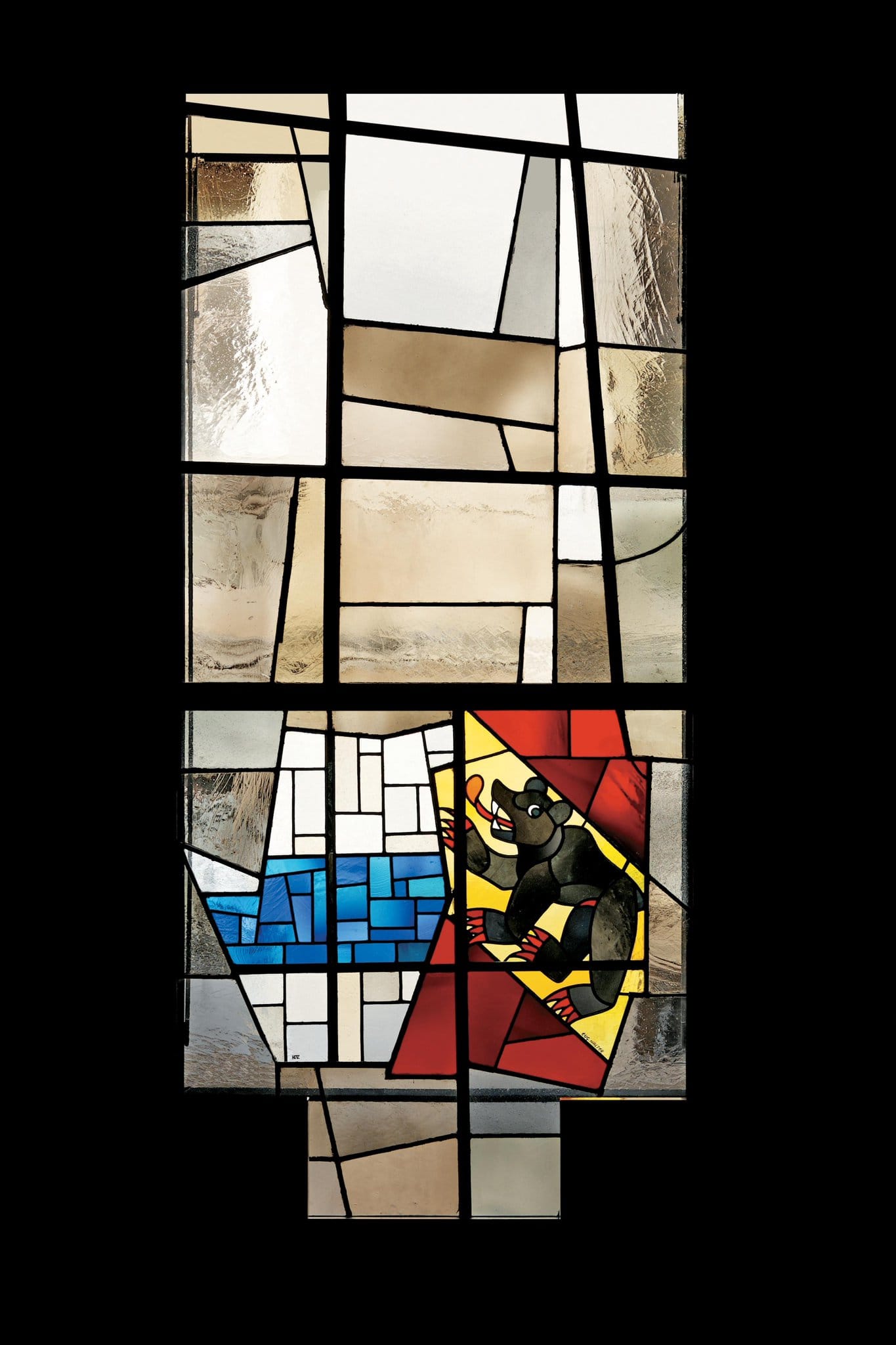 Les armoiries de Zoug et Berne sont côte à côte dans la partie inférieure de la fenêtre composée de verres clairs.