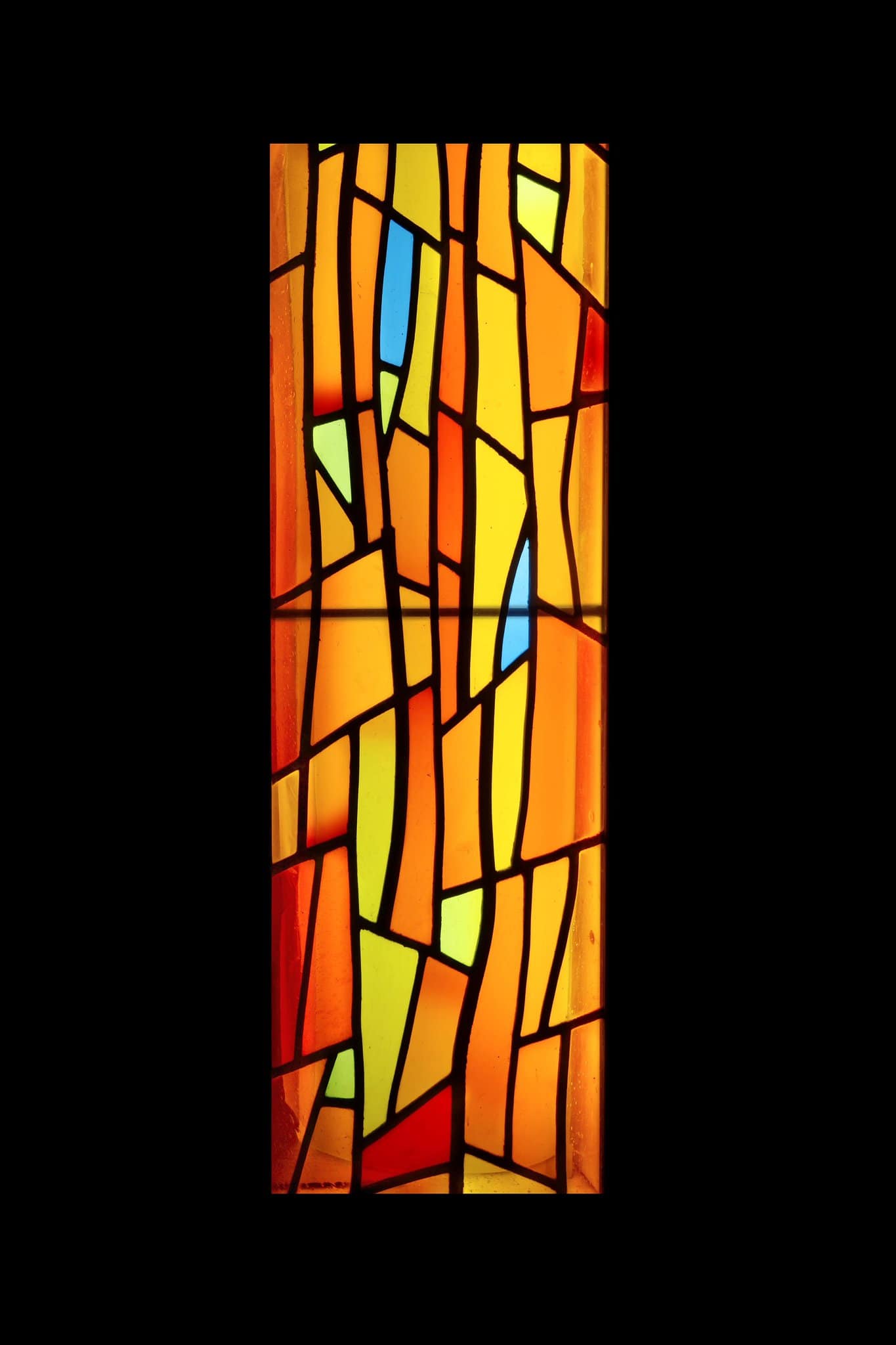 Vitrail non figuratif composé de tons chauds oranges, jaunes et rouges avec des touches de vert et de bleu.