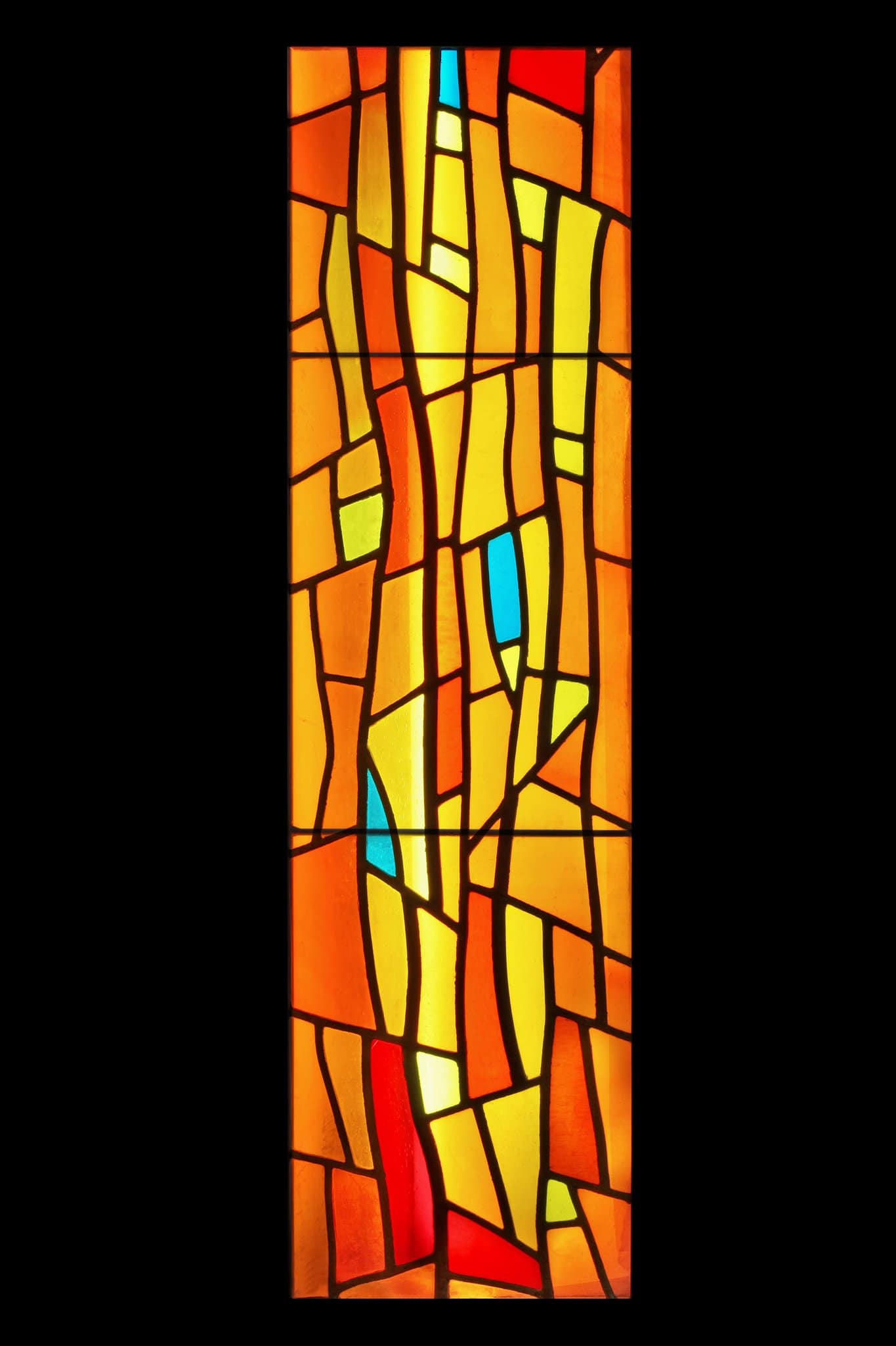Vitrail non figuratif composé de tons chauds oranges, jaunes et rouges avec des touches de vert et de bleu.