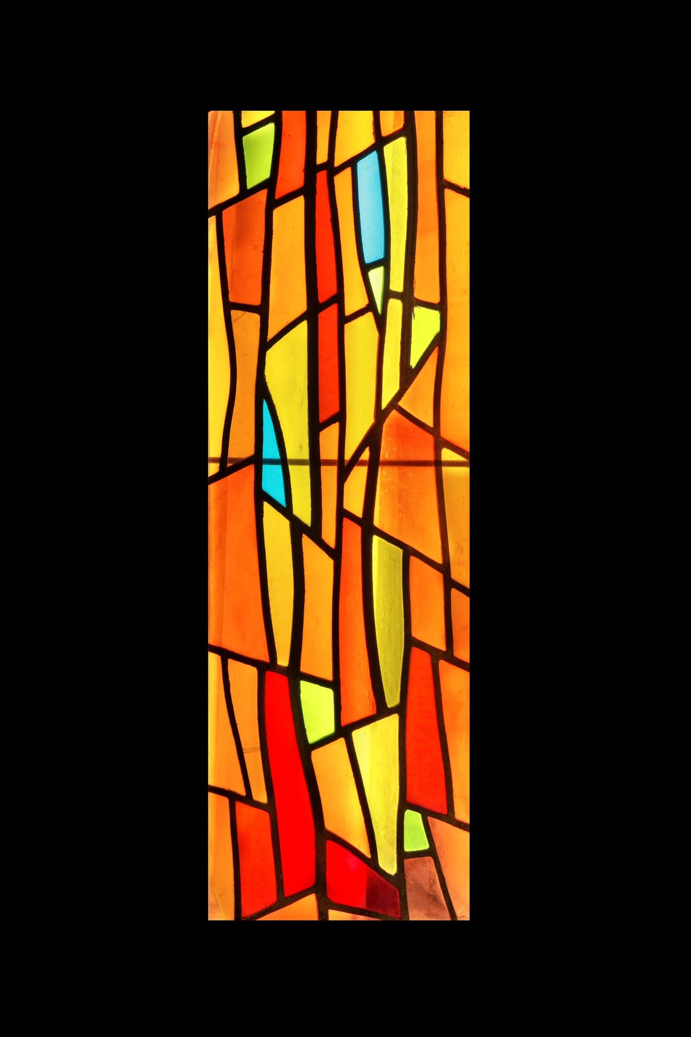 Vitrail non figuratif composé de tons chauds oranges, jaunes et rouges avec des touches de vert et de bleu.