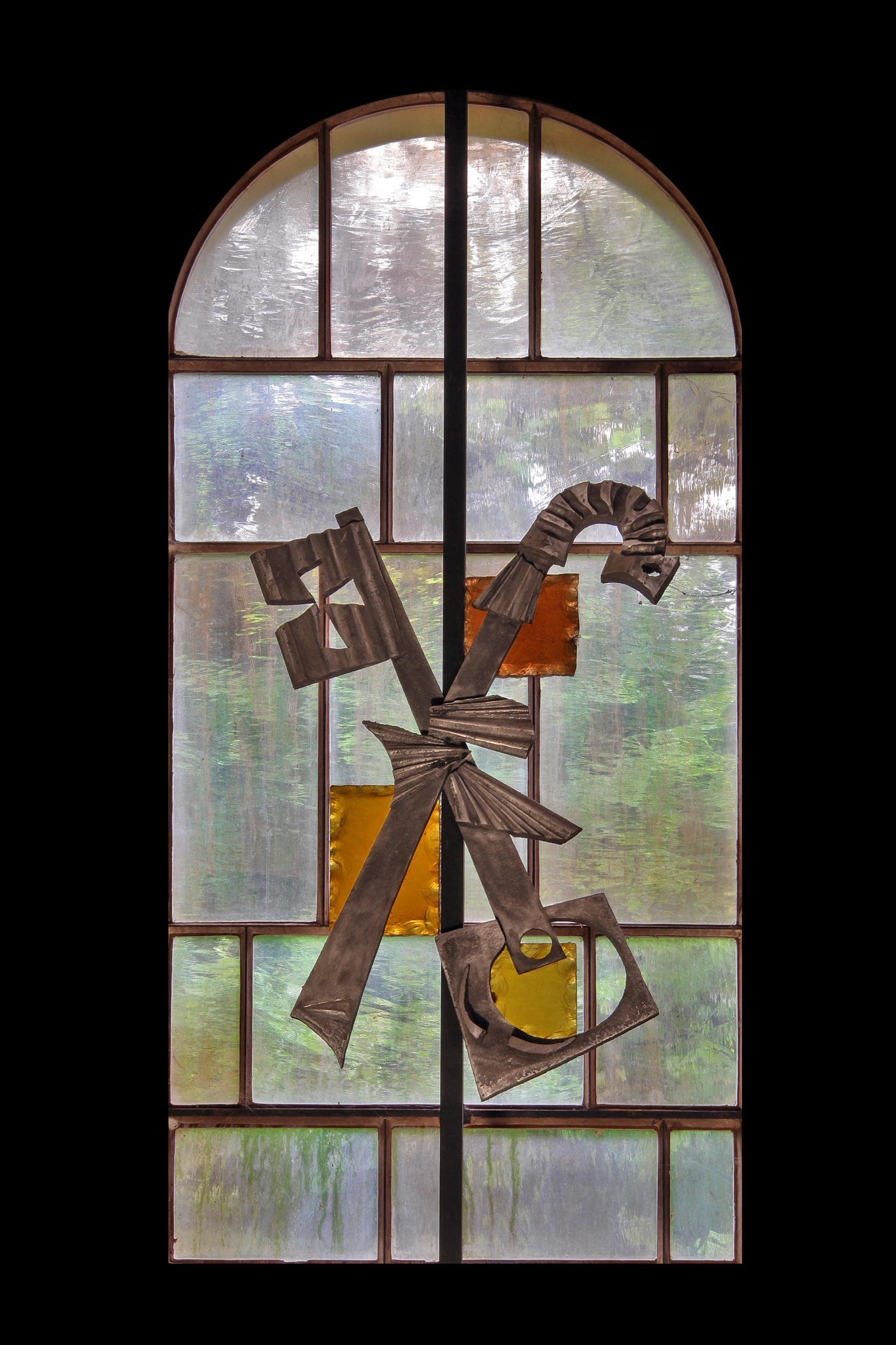 Devant, une crosse et clé sculptée avec des incrustations de dalles de verre jaunes montés sur une barre métallique. Derrière, une fenêtre de verre blanc mis en plomb.