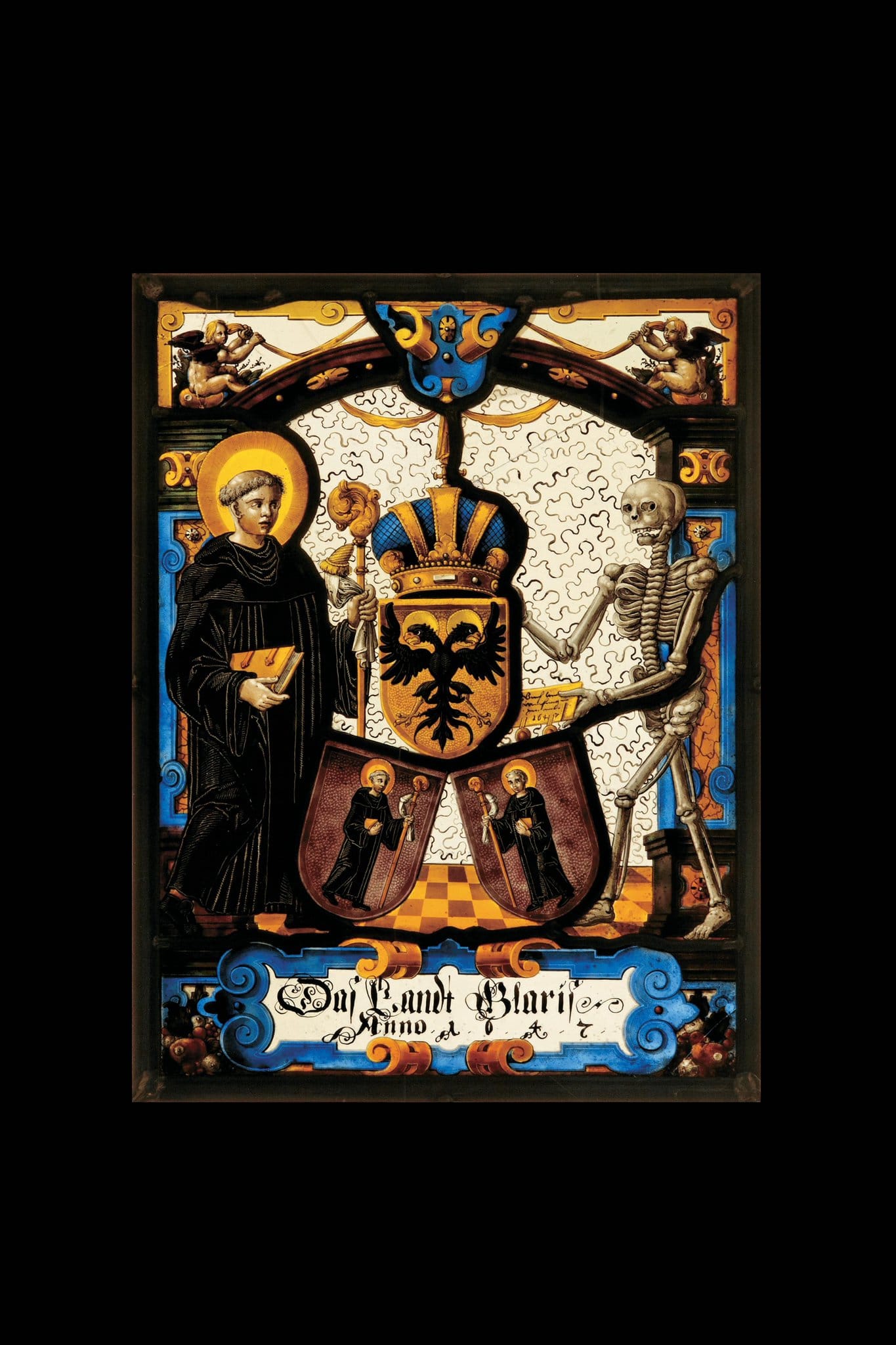 Les armoiries de l’Empire couronnées surmontent deux écussons glaronnais tenus par saint Fridolin et par le squelette d’Ursus, rappelé de la mort pour témoigner dans un procès. En haut dans les écoinçons deux anges tiennent une banderole.