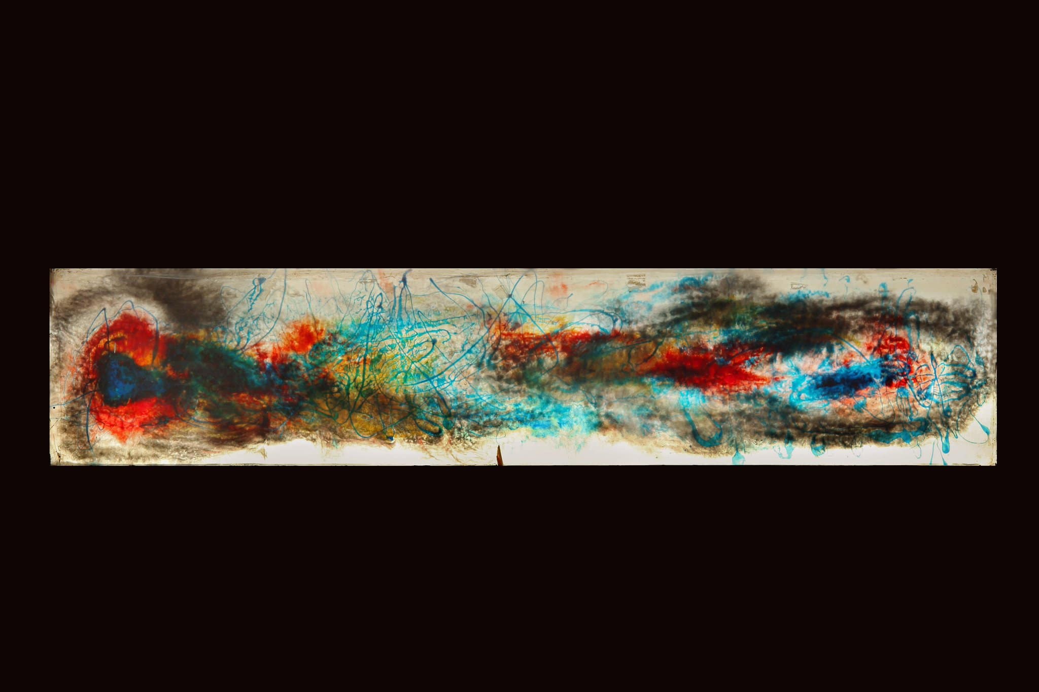 Un dessin et des lignes bleues sur un décor orange, bleu et brun sur fond blanc.