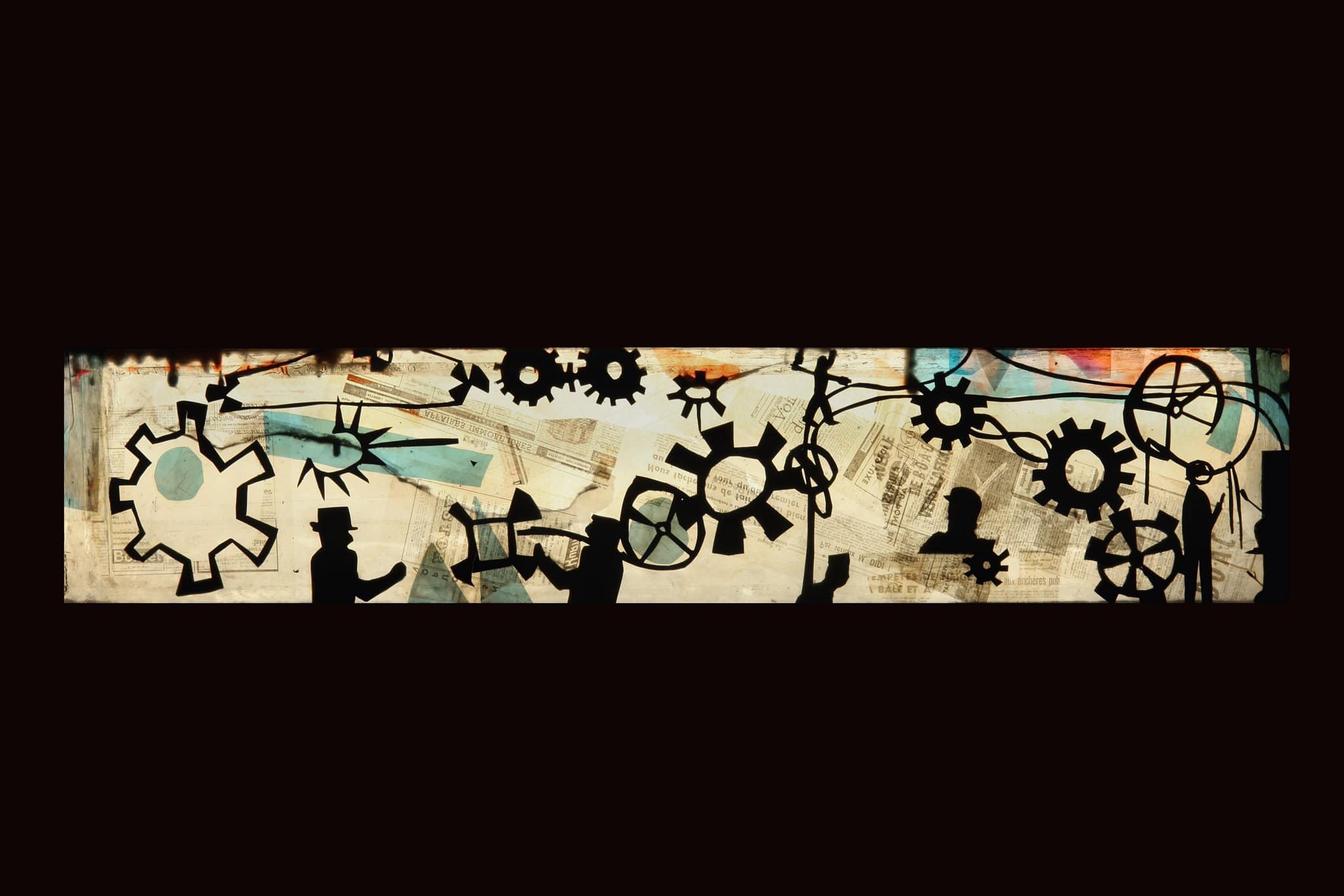 Des roues de différente grandeur tournent. Quelques personnages de profil, en buste ou en pied vaquent à leur tâche. Le tout sur fond blanc couvert de coupures de journaux.