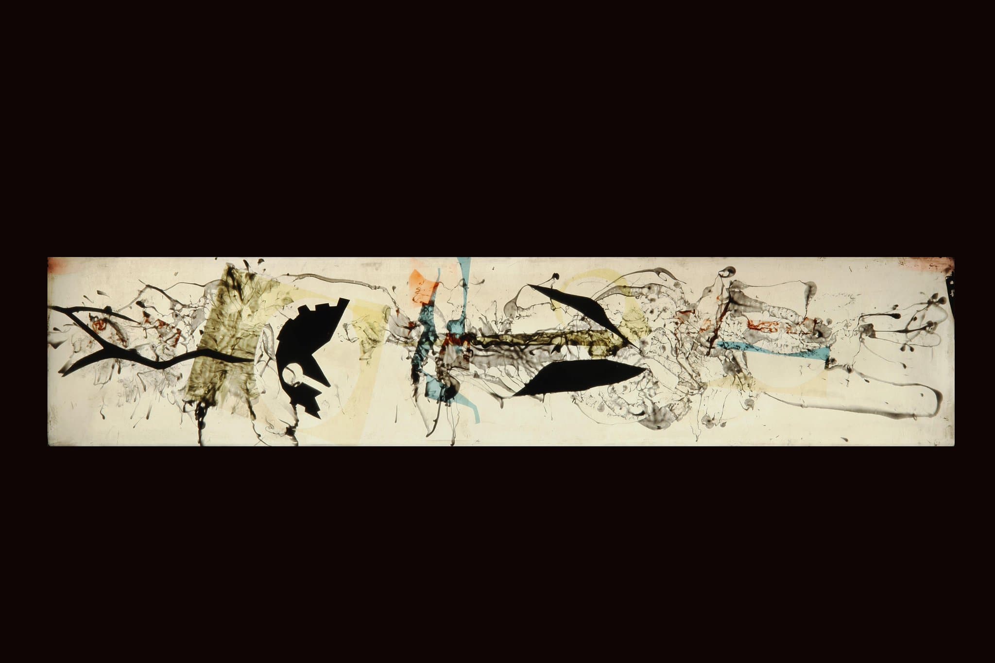 Un dessin de lignes et taches noires sur un fond blanc parsemé de quelques taches jaunes, oranges et bleues.