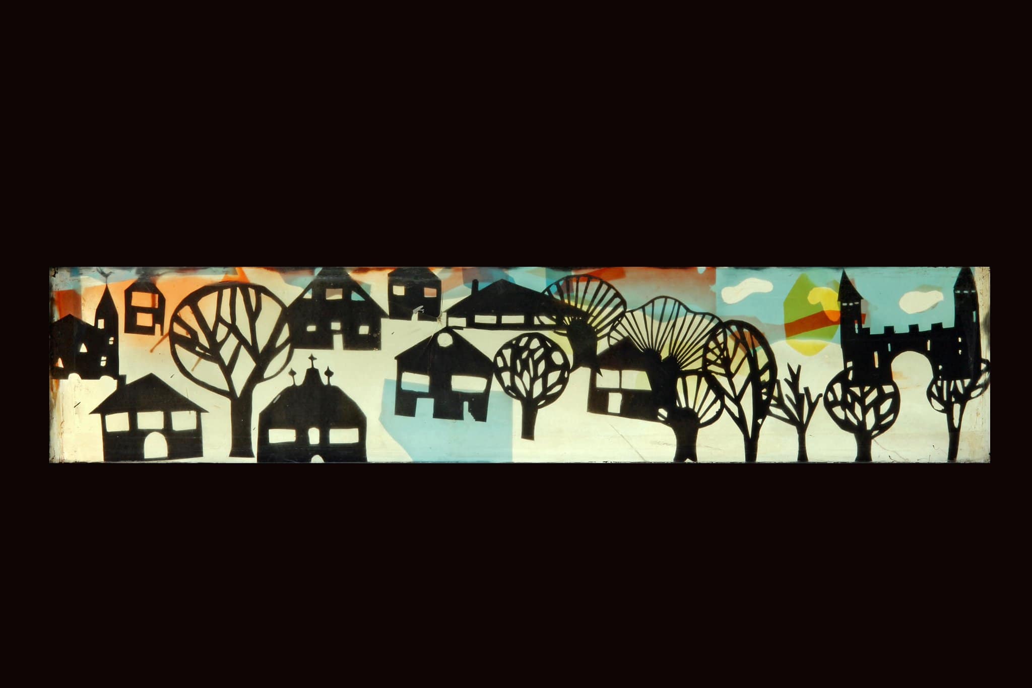 Un village composé d’une église, une école, sept maisons et un château avec quelques arbres. Le tout sur fond blanc avec quelques taches bleues, oranges et jaunes.