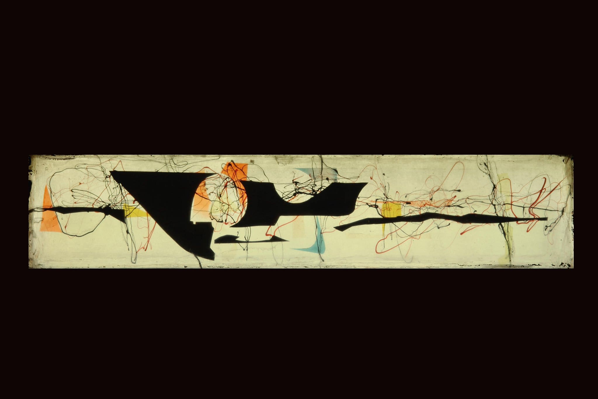 Un dessin de lignes et grandes taches noires sur un décor de taches oranges, jaunes et bleues sur fond blanc et noir.