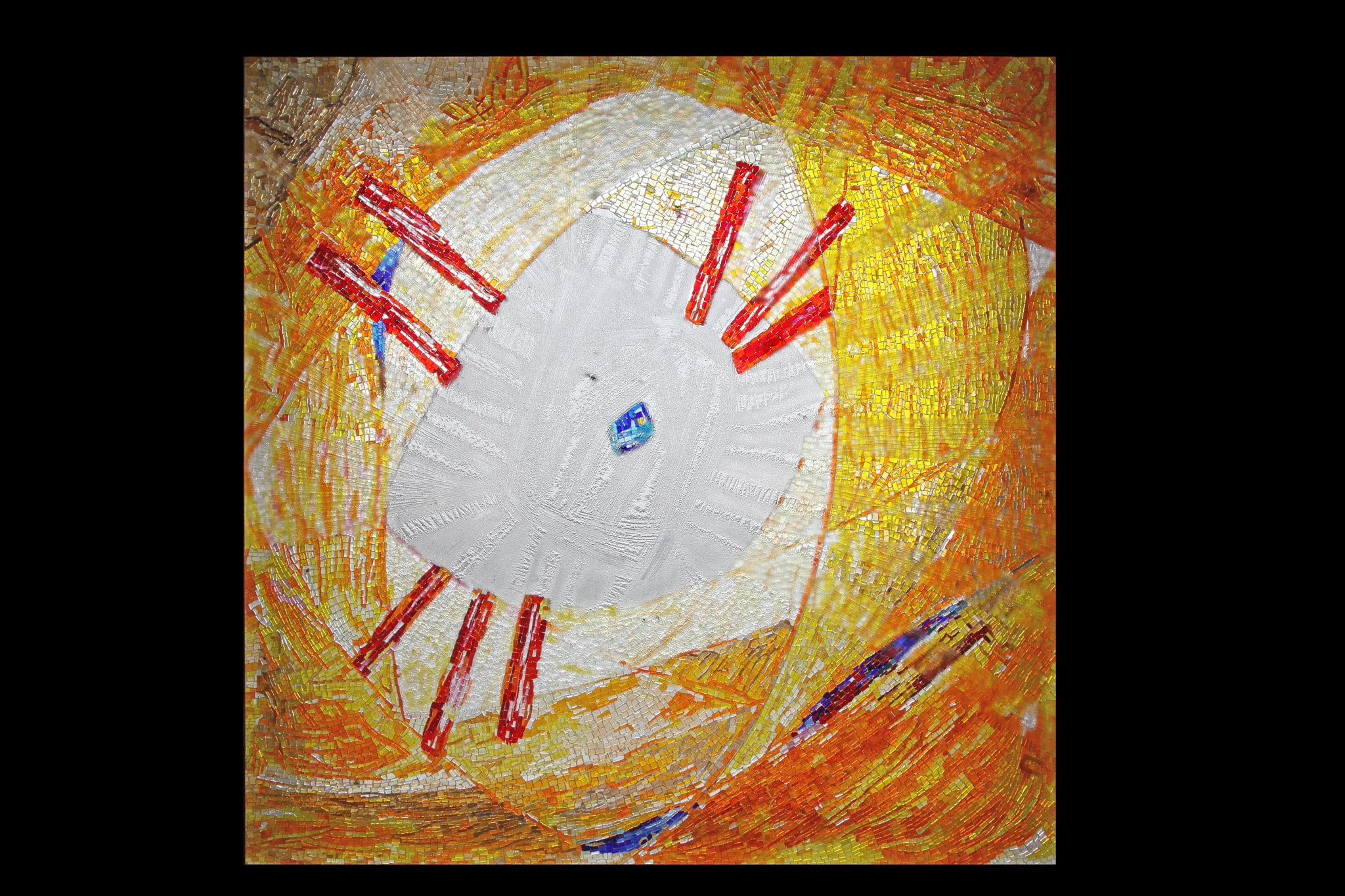 Au centre, une pièce en verre blanc gravé d’où s’échappe des rayons lumineux en mosaïque rouge. Autour, de la mosaïque dans les teintes blanches, jaunes, oranges et rouges.