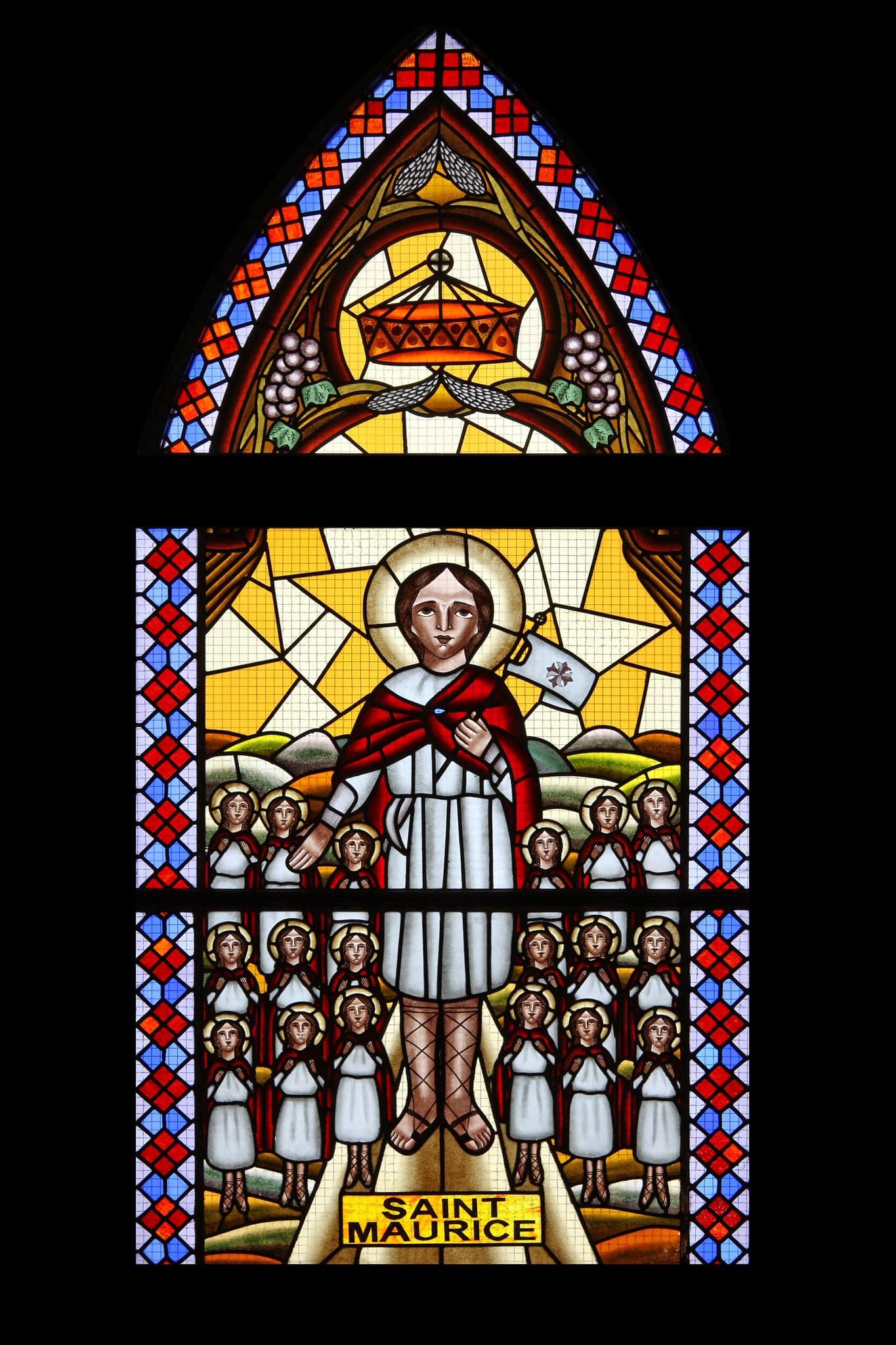 Saint Maurice, debout, est représenté en soldat romain et porte un grand manteau rouge. Il tient un étendard dans sa main droite. Au-dessus de sa tête il y a une couronne. Il est entouré de saints portant les mêmes vêtements que lui. Une large bordure géométrique bleue et rouge encadre le vitrail.