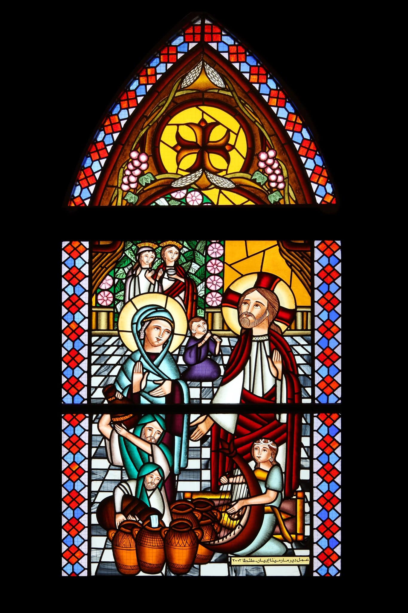 Marie signale à Jésus que le vin vient à manquer. Il ordonne aux serviteurs de remplir d’eau six jarres qu’il transforme en vin. A droite une jeune femme joue de la harpe. A l’arrière plan, on aperçoit les mariés. Une large bordure géométrique bleue et rouge encadre le vitrail.