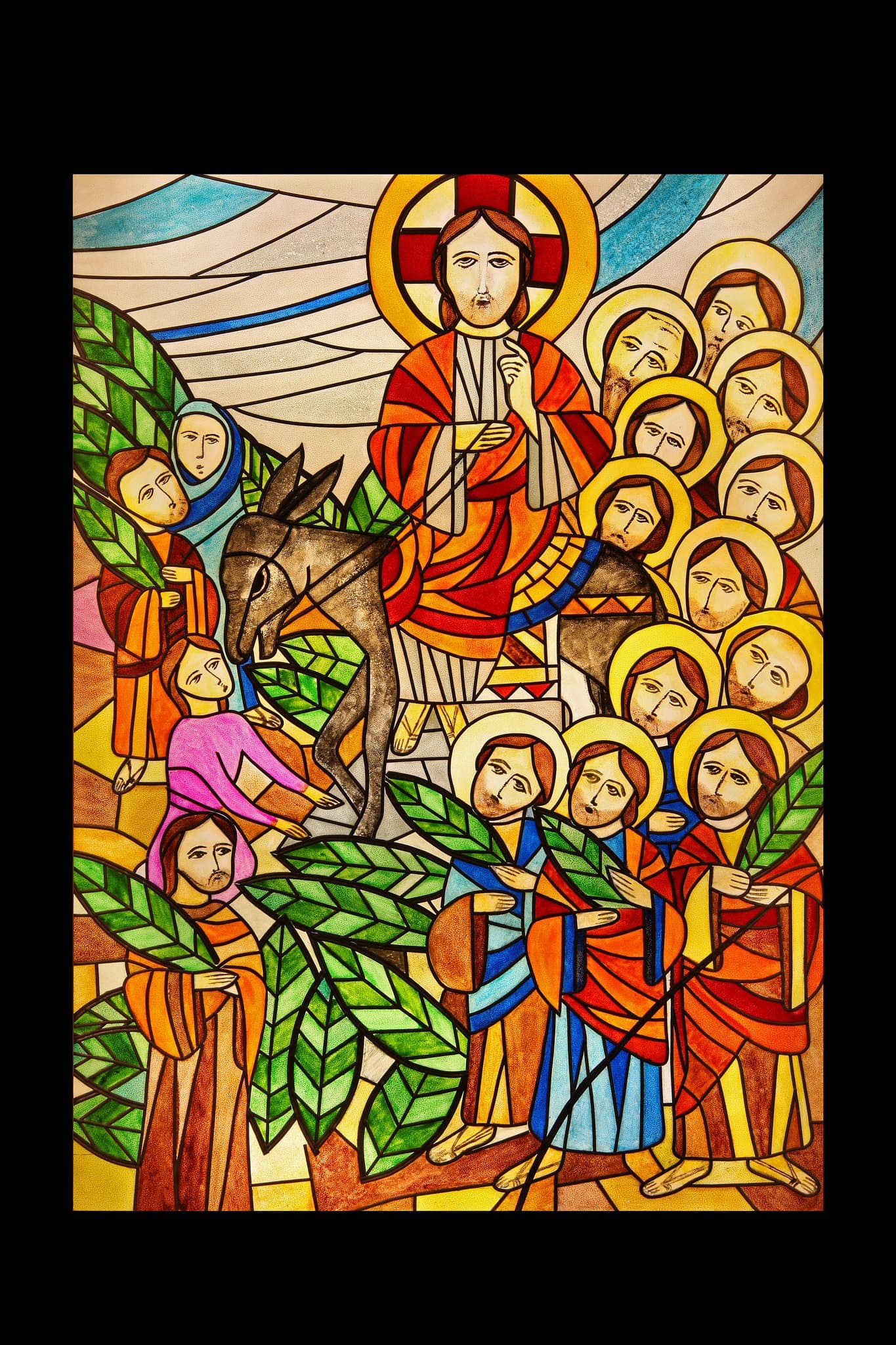 Le Christ sur son âne est acclamé par une foule tenant dans ses mains la palme du martyre. Il fait le signe de la bénédiction.