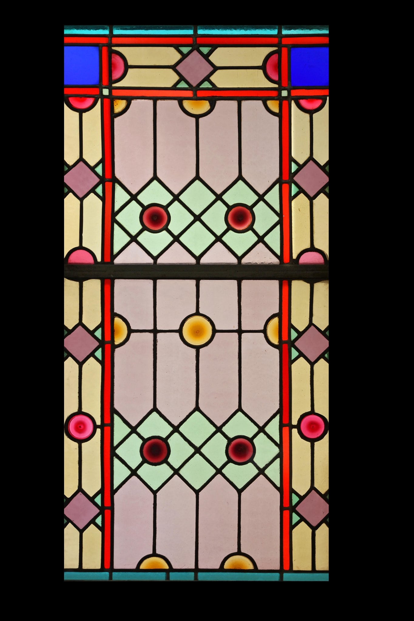 Vitrail géométrique composé de verres clairs et de culs de bouteille. Dans les angles supérieurs, deux carrés bleus sans dessin.