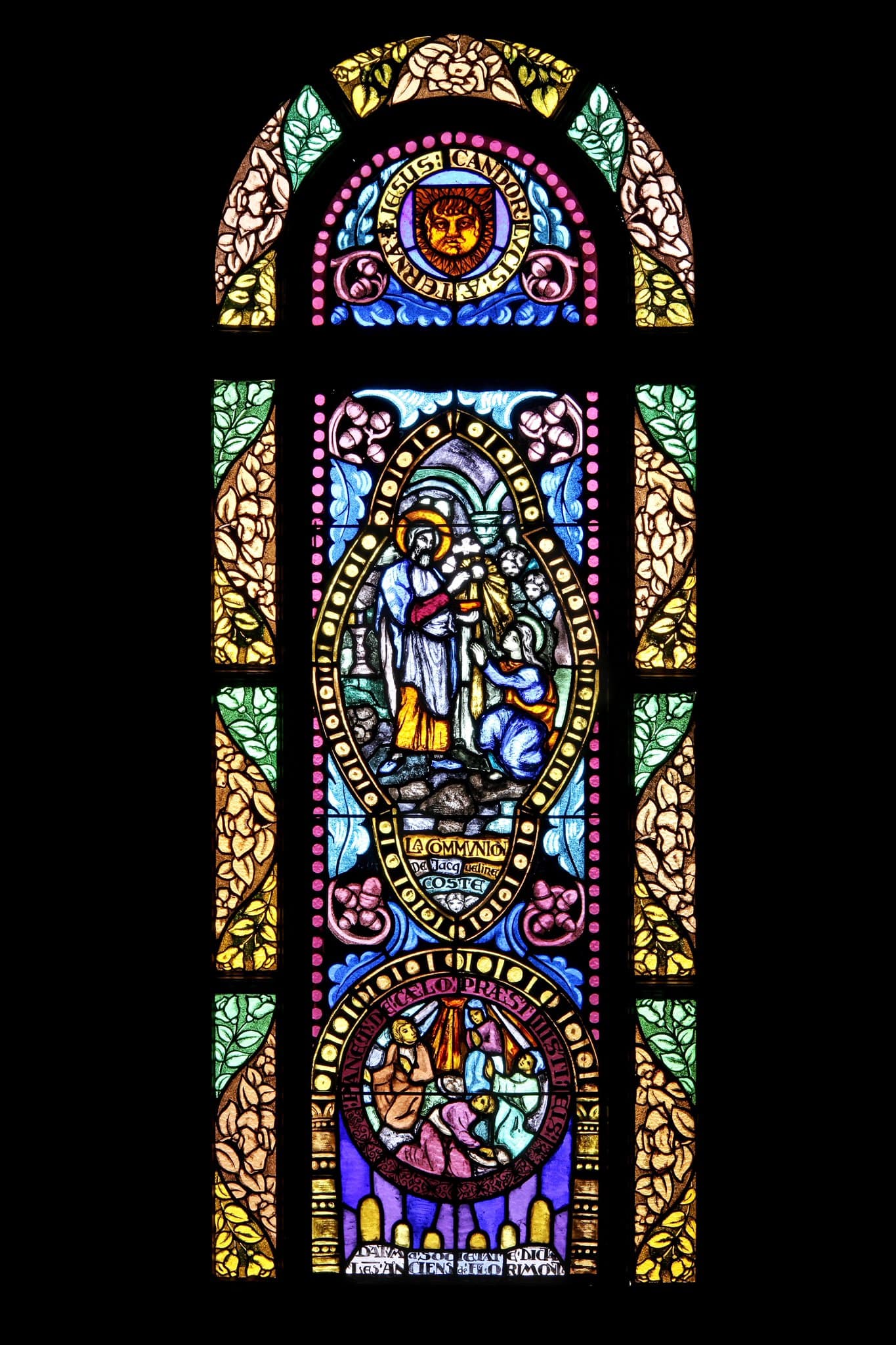 JESUS : CANDOR LVCIS : AETERNAE (médaillon en haut) // LA COMMVNION / DE Jacqueline / COSTE (banderole sous scène centrale) // PANEM : DE : CAELO : PRAESTISTI: EIS (médaillon en bas) // DATVM /a SOCIETATE /DICTA// LES ANCIENS de FLORIMONT (en bas)