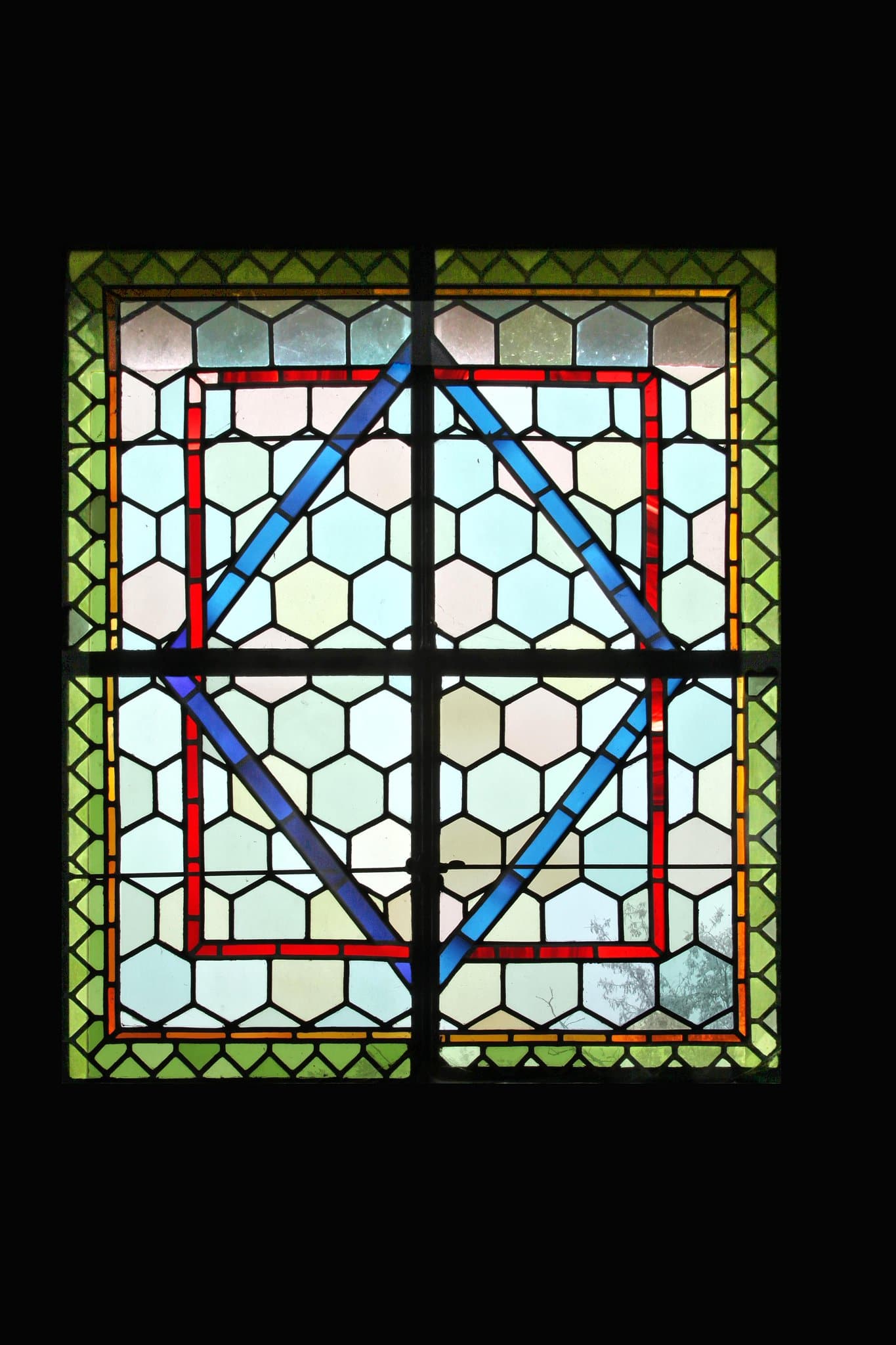 Un grand losange bleu inscrit au centre d’un rectangle rouge sur un fond de verres blancs hexagonaux. Le tout entouré d’une bordure orange et jaune.