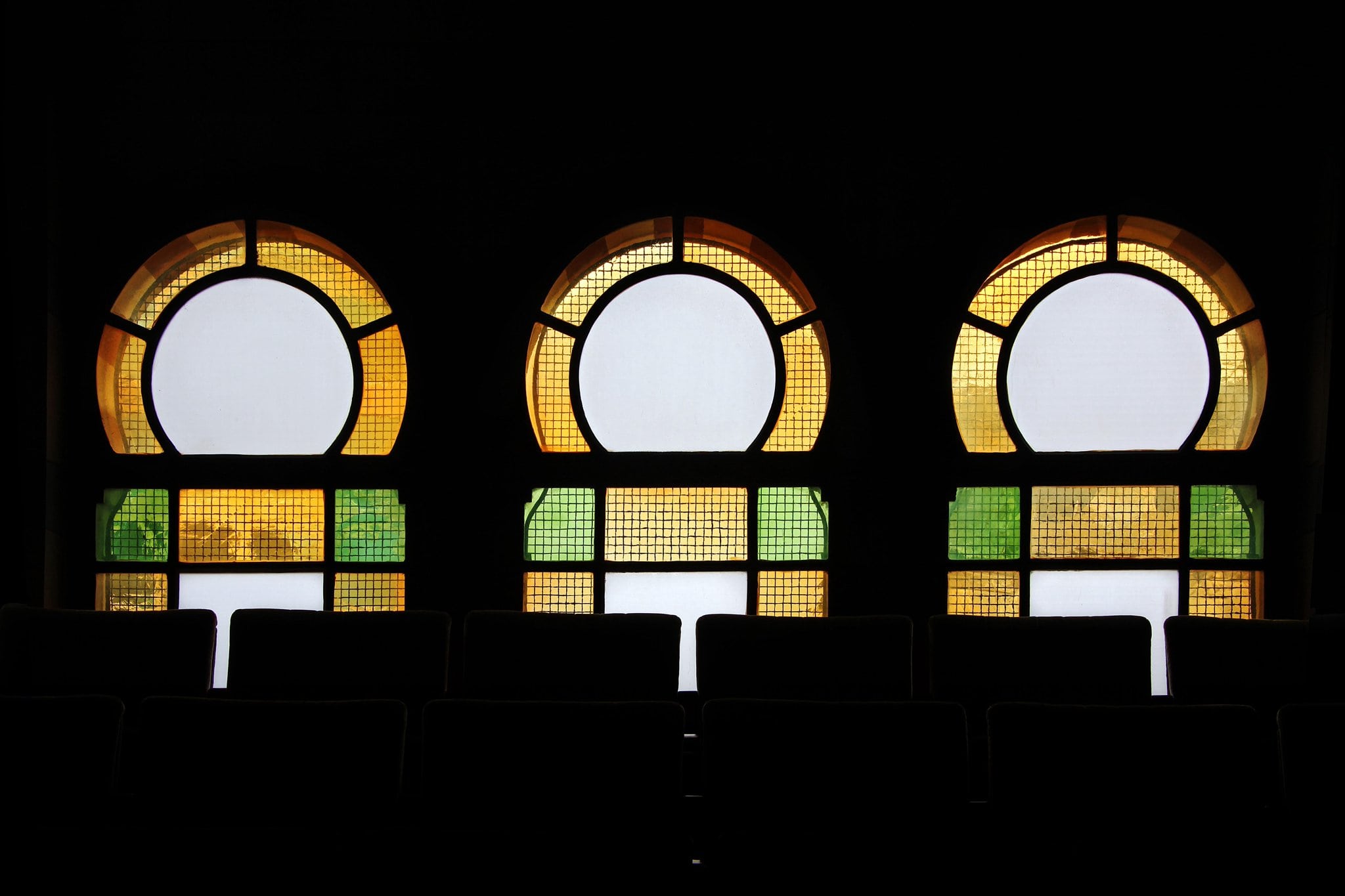 Trois vitraux ornementaux avec une bordure jaune et du vert aux quatre angles.