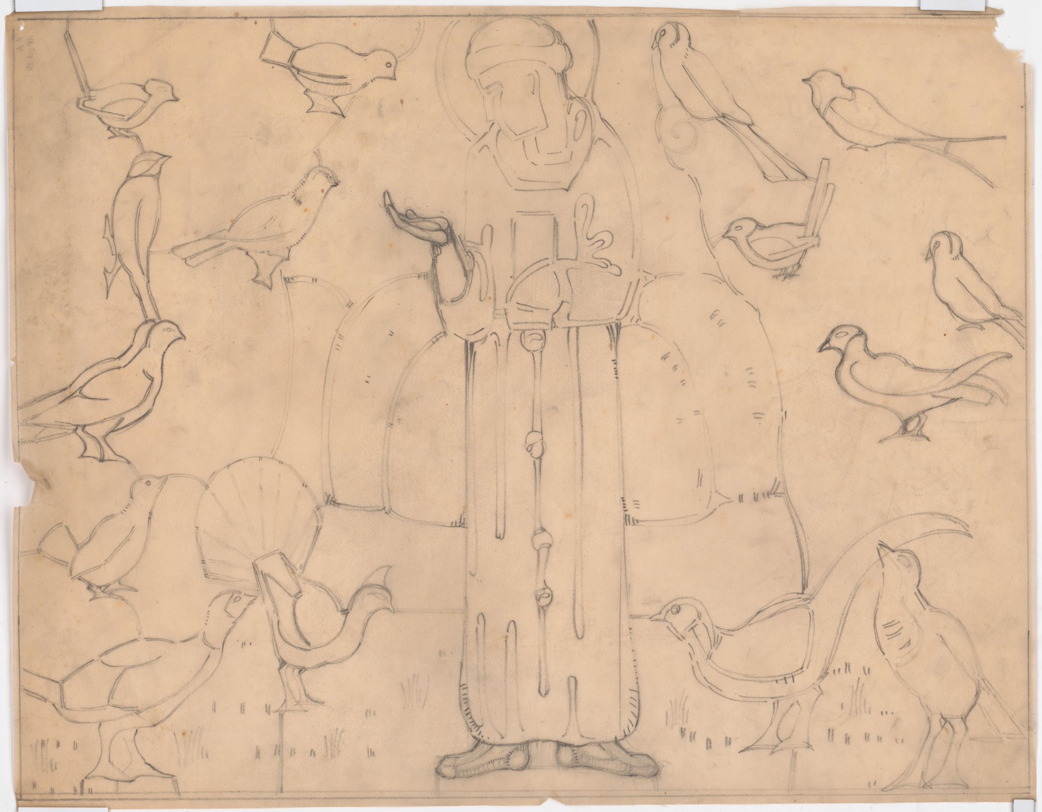 Sur cette esquisse, Poncet a déjà donné au saint sa posture définitive et étudie la disposition des oiseaux autour de lui. Ces derniers sont encore traités d'une manière assez réaliste qu'il délaissera au profit de silhouettes plus stylisées dans les versions finales de son projet (MP_01.26 ; MP_01.27). Ce dessin peut être lié à une esquisse au crayon (MP_01.21) sur laquelle il étudie, sans doute d'après des modèles issus de livres d'ornithologie, différentes espèces d'oiseaux, dans une démarche typique du souci de bien faire d'un jeune artiste tout juste sorti des Beaux-Arts.