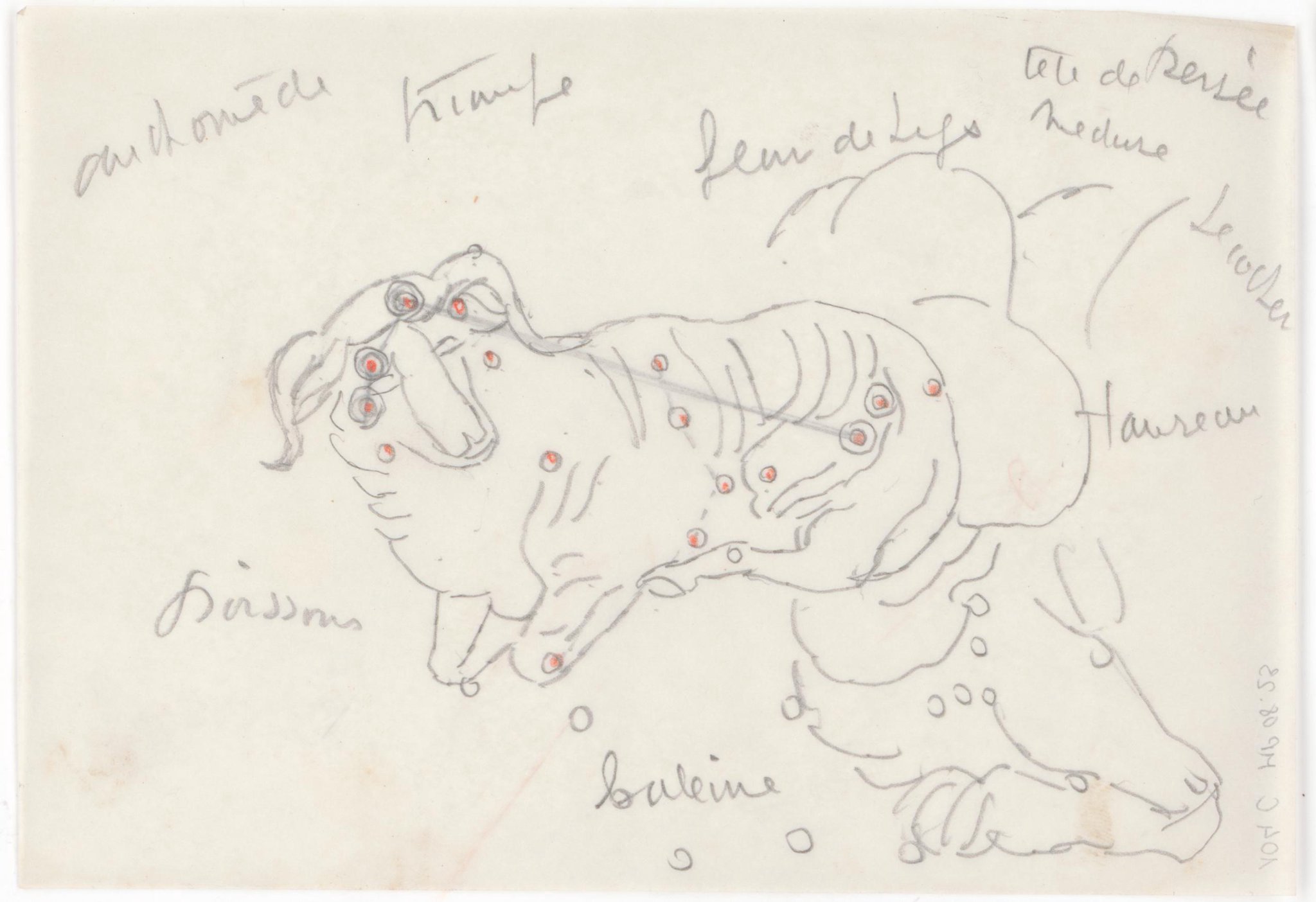 [De gauche à droite et de haut en bas :] andromède // triangle // fleur de lys // tete de Persée / Meduse / [...] / taureau / poissons / baleine