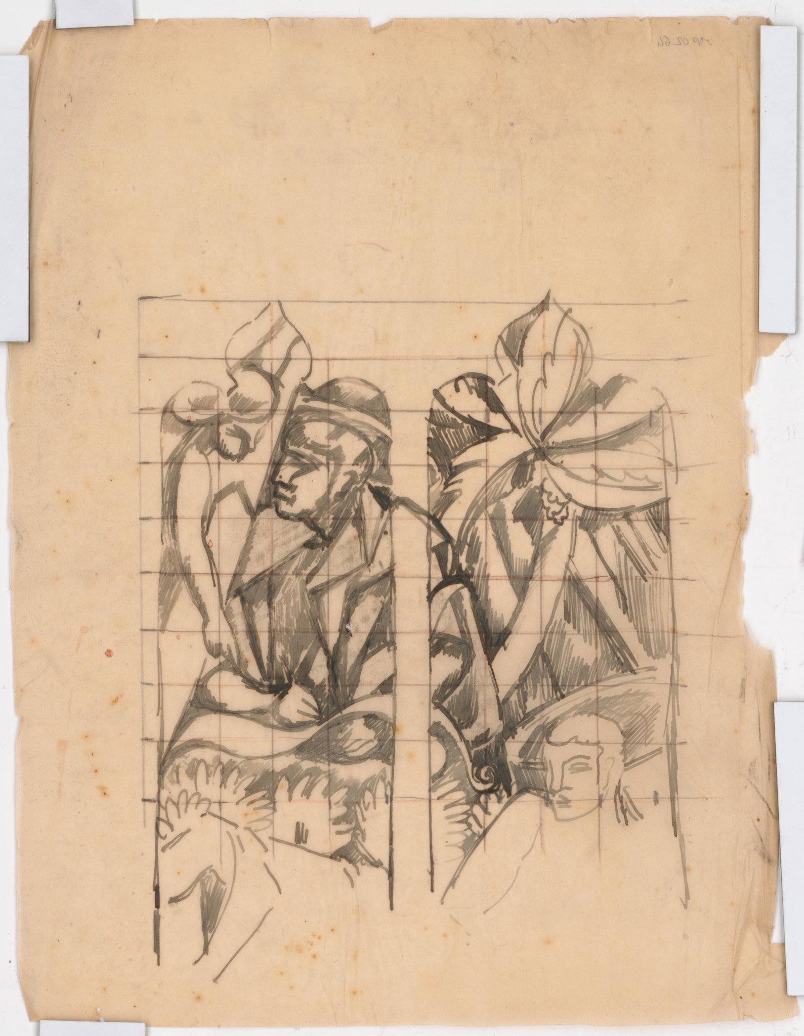 Esquisse quadrillée pour le vitrail des quatre Évangélistes : partie haute des deux lancettes centrales avec saint Mathieu et l'ange et une partie du saint Jean ou saint Luc couché.