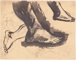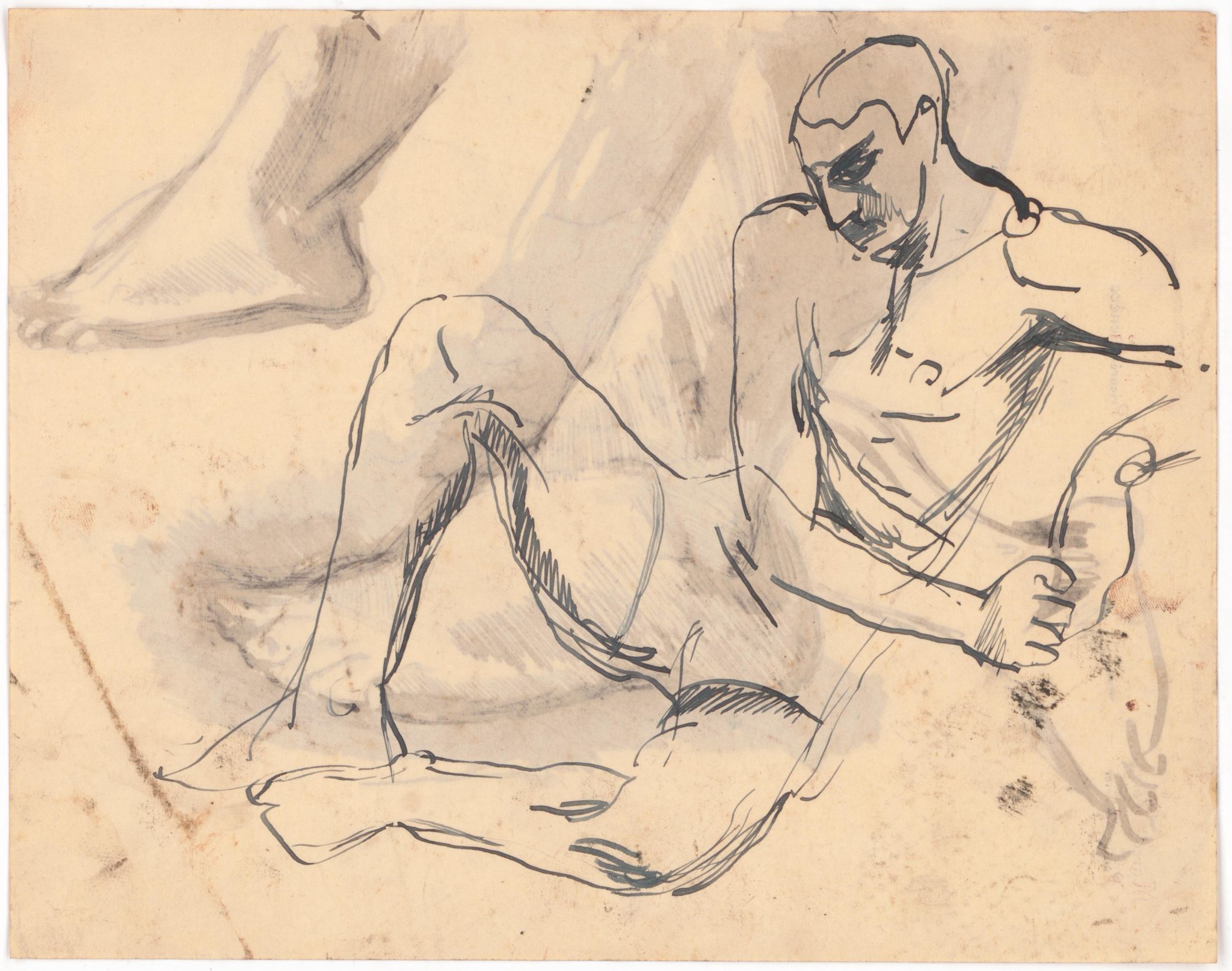 Saint Jean ou saint Luc couché, prenant appui sur son bras gauche, les jambes allongées de côté.