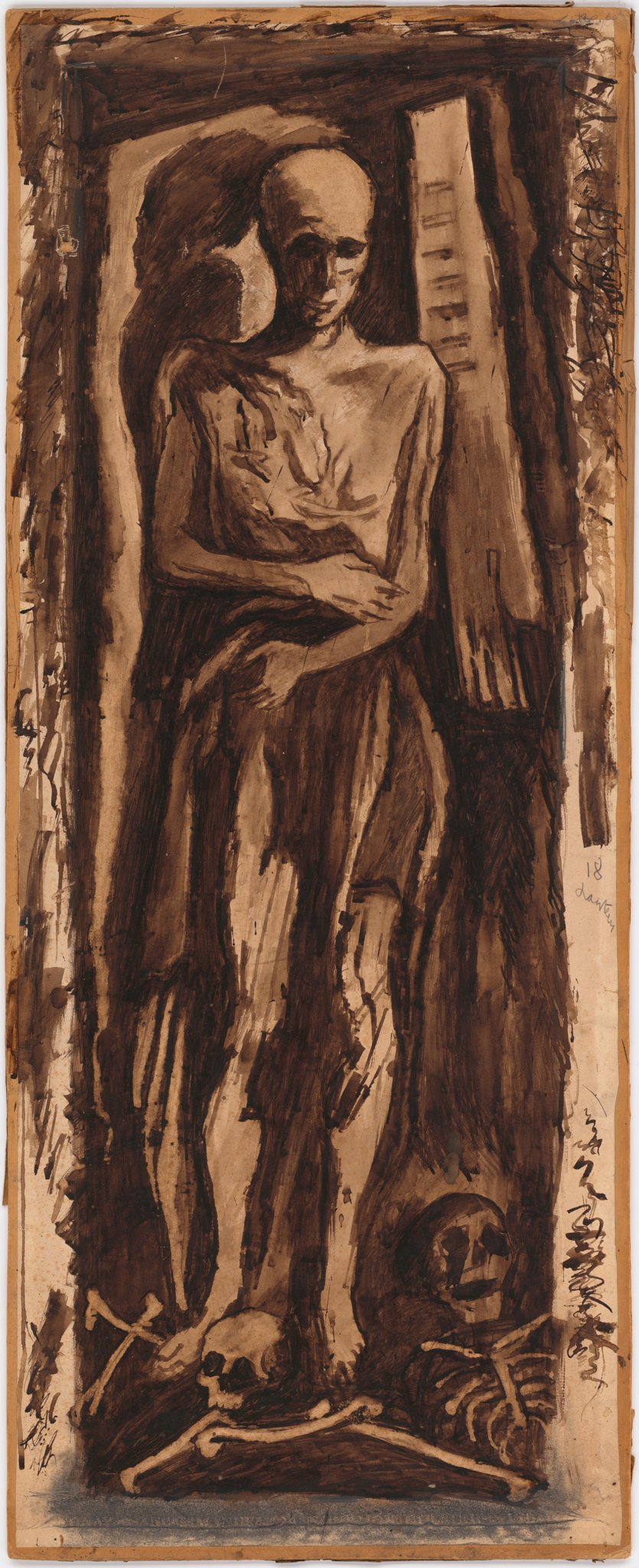 Le prophète Ezéchiel debout, le corps décharné, entouré de crânes jonchant le sol à ses pieds.