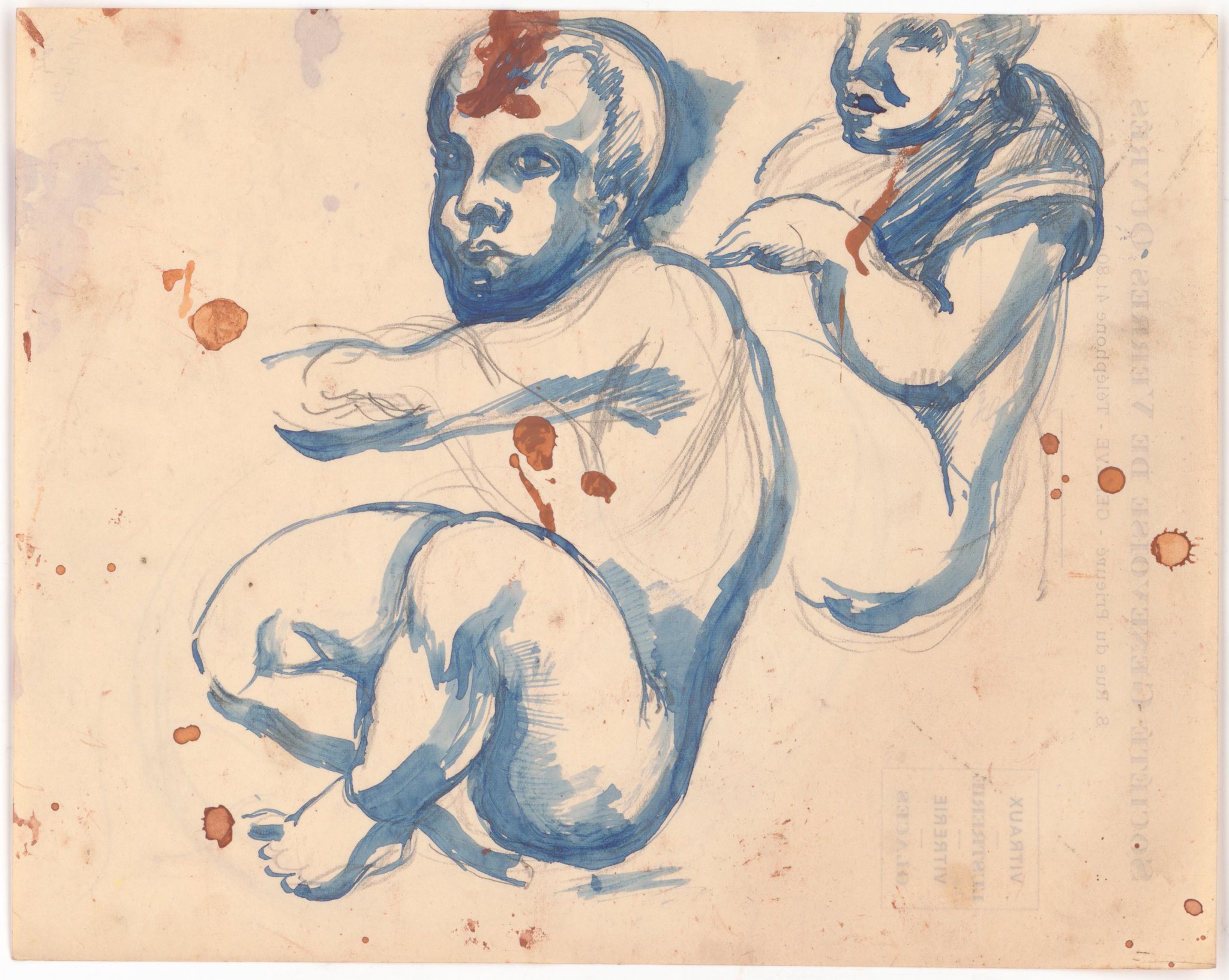 Deux esquisses du Christ enfant assis, le corps en mouvement, le bras tendu pour celui de gauche et replié pour celui de droite.