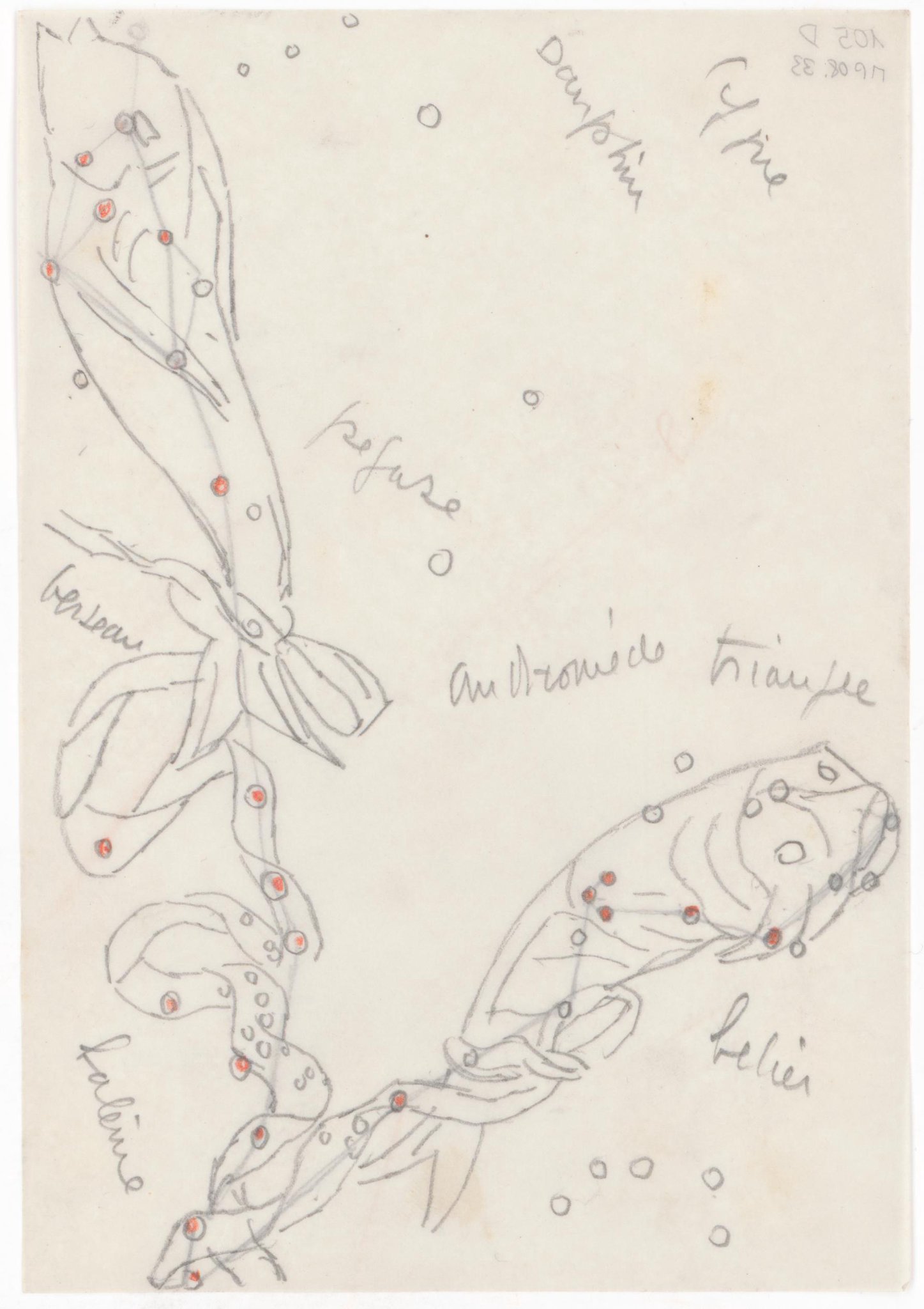 Étude pour des vitraux sur le thème de la "carte du ciel": les Poissons, liés l'un à l'autre par un ruban et dirigés tous deux dans une direction différente. La figure suit le tracé des étoiles et des lignes de sa constellation (dessinées au crayon au verso).