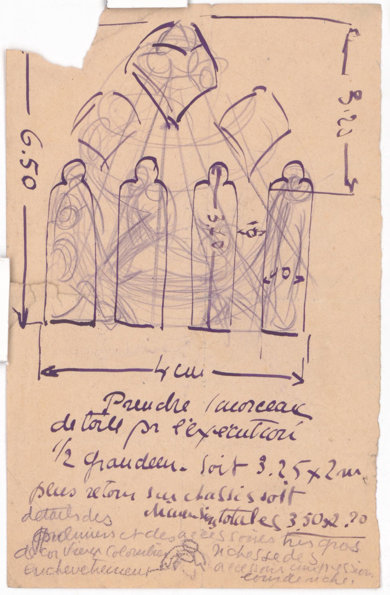 Esquisse du vitrail des quatre Évangélistes avec mesures des baies, notes et positionnement des personnages esquissé.
