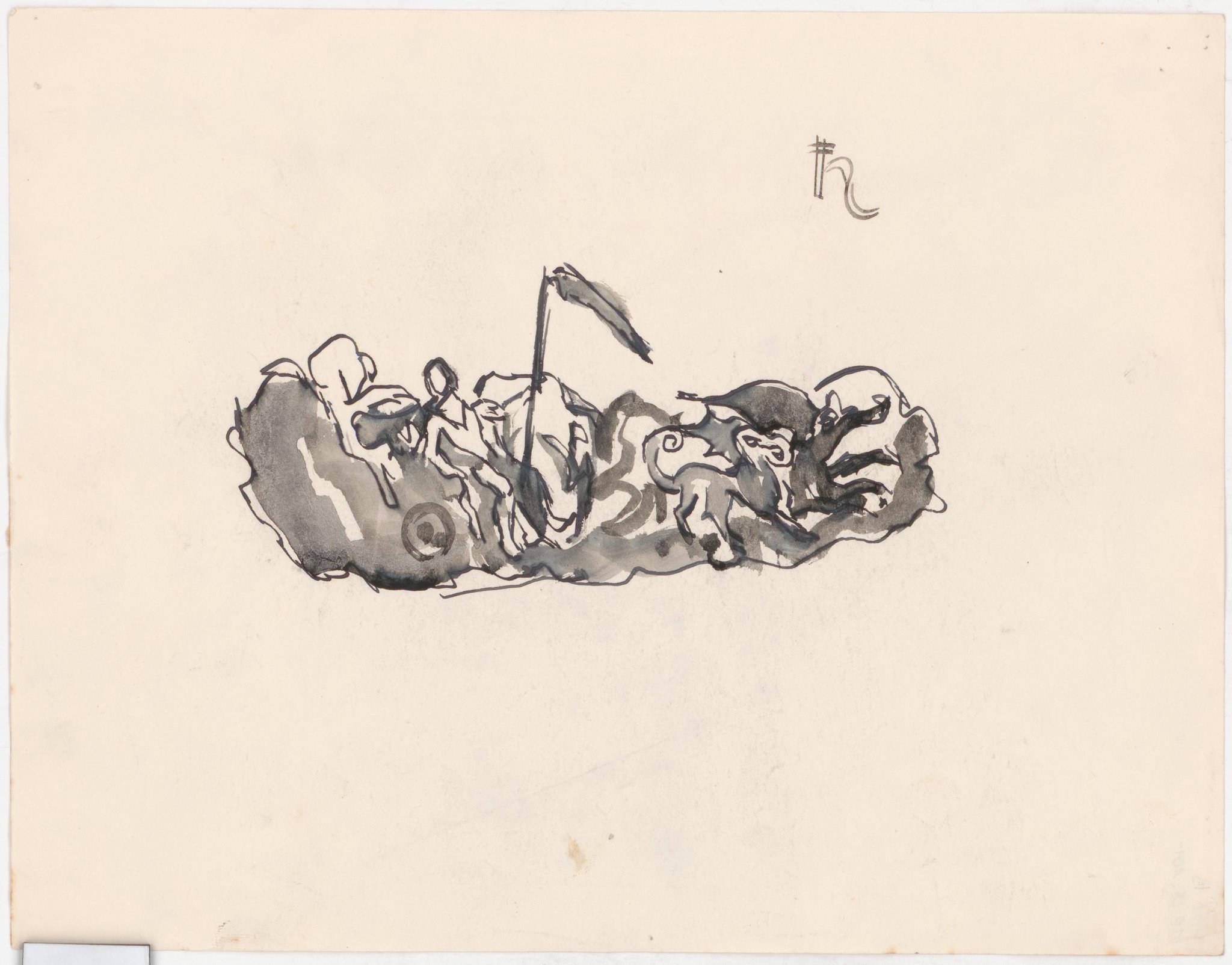 Esquisse pour des vitraux sur le thème de la "carte du ciel" : le Dieu Saturne tenant une faux, sur un char tiré par deux créatures mythologiques. En haut à droite : symbole de la planète Saturne.