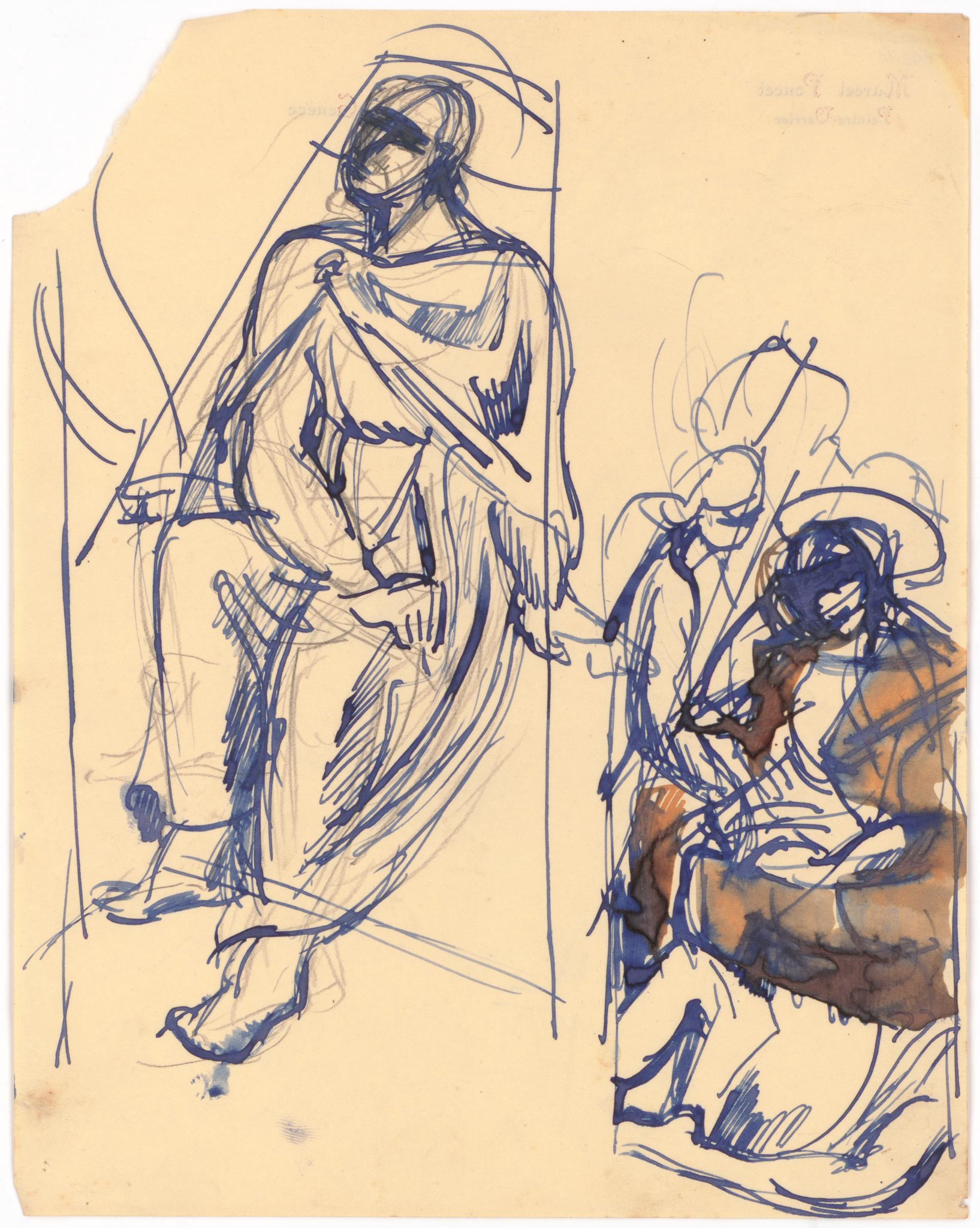 Ce projet fait probablement partie des premiers travaux de Poncet pour le vitrail des quatre Evangélistes, où il étudie la posture de saint Mathieu assis avec l'ange.