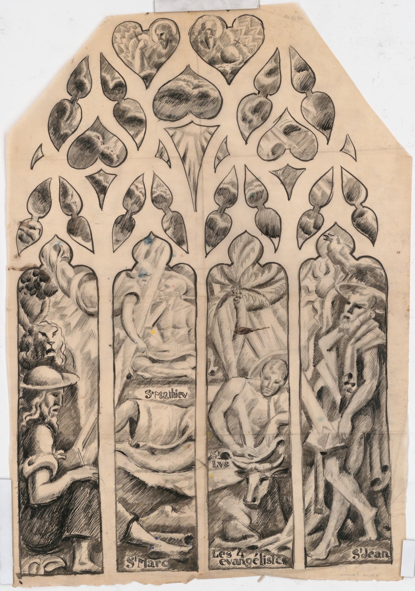 Dans la moitié inférieure correspondant aux lancettes : les quatre Évangélistes et leurs attributs au sein d'un paysage exotique. A gauche, saint Marc assis, en dessous du lion. Au centre, saint Luc allongé accompagné du taureau couché, surmonté de saint Mathieu et l'ange. Debout à droite, saint Jean et l'aigle. Dans la partie haute, correspondant aux éléments de remplage : la Trinité. A gauche, le Christ tenant la croix et le Père tendant le globe terrestre à droite. De grands rais de lumière émanent de la Trinité, baignant toute la composition.