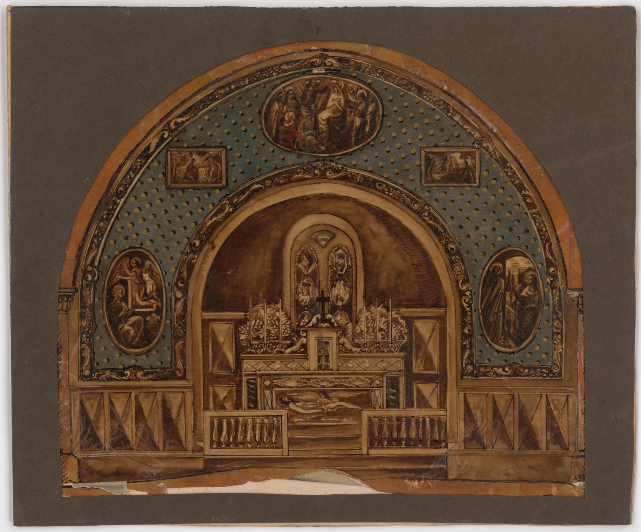 Projet en couleur pour la décoration de l'abside de l'église de Chessenaz : sur l'arc absidial, trois médaillons avec scènes de la vie de la vierge (l'Annonciation à gauche, la Visitation à droite et le Couronnement de la Vierge au centre). De chaque côté du médaillon central, deux petites scènes rectangulaires avec peut-être le sacrifice d'Abel à gauche, et un personnage visité par deux anges à droite. Au centre de l'abside, l'autel et le vitrail comportant des scènes de la vie de la Vierge et du Christ.