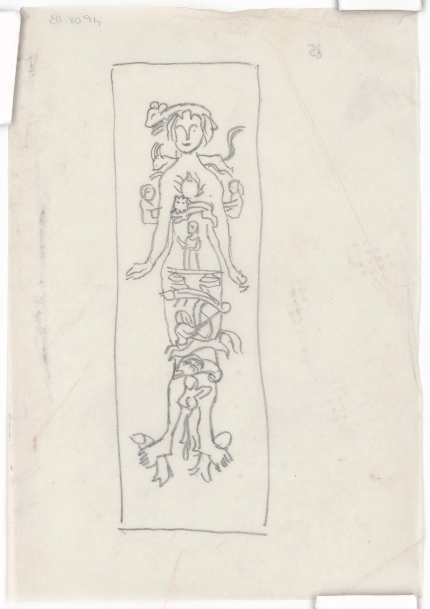 Esquisse pour des vitraux sur le thème de la "carte du ciel" : un homme zodiaque (Les poissons sous ses pieds, le verseau le long des mollets, le capricorne sur ses genoux, le sagittaire et le scorpion sur ses cuisses, la balance et la vierge sur son ventre, le lion sur son plexus, le cancer sur sa poitrine, les gémeaux sur ses deux bras, le taureau derrière son cou et le bélier sur sa tête).