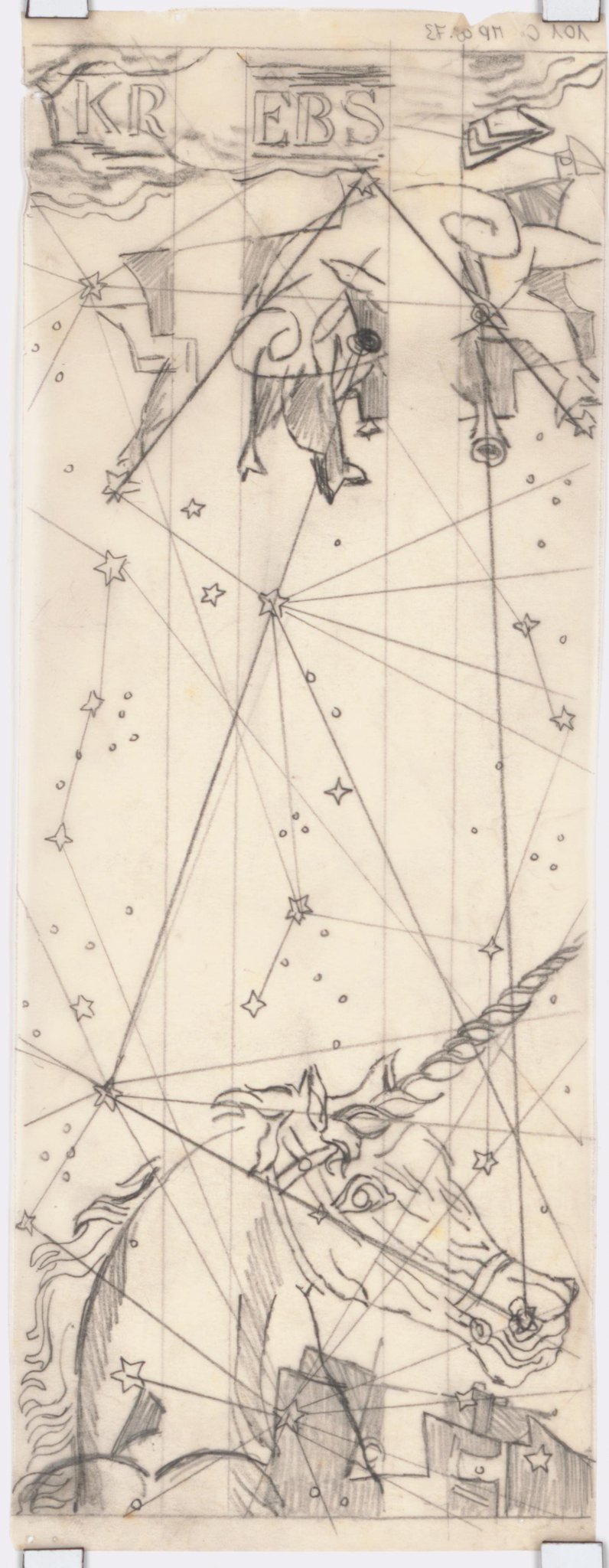 Projet pour des vitraux sur le thème de la "carte du ciel" : vitrail du mois de juin et du signe du Cancer. En bas, la licorne, pour la constellation du même nom. En haut, le Cancer au milieu de nuages. La composition est traversée par les tracés des constellations et des étoiles.