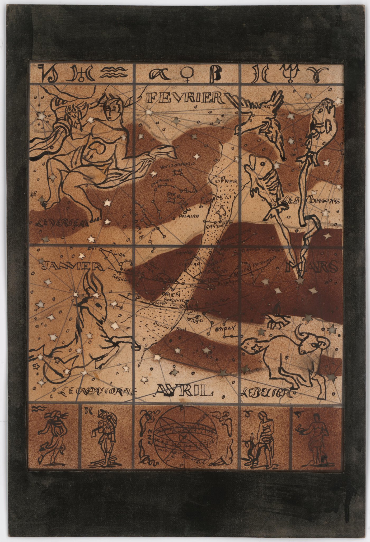 Projet en camaïeu pour des vitraux sur le thème de la "carte du ciel" : les signes du zodiaque et constellations sont représentés autour du centre avec les tracés des constellations. De gauche à droite et de haut en bas : le Verseau, la Colombe, les Poissons, le Bélier, le Capricorne. Dans la bordure du haut : les symboles des signes du zodiaque. Dans la bordure du bas : le système zodiacal au centre, et quatre personnifications des mois sur les côtés.