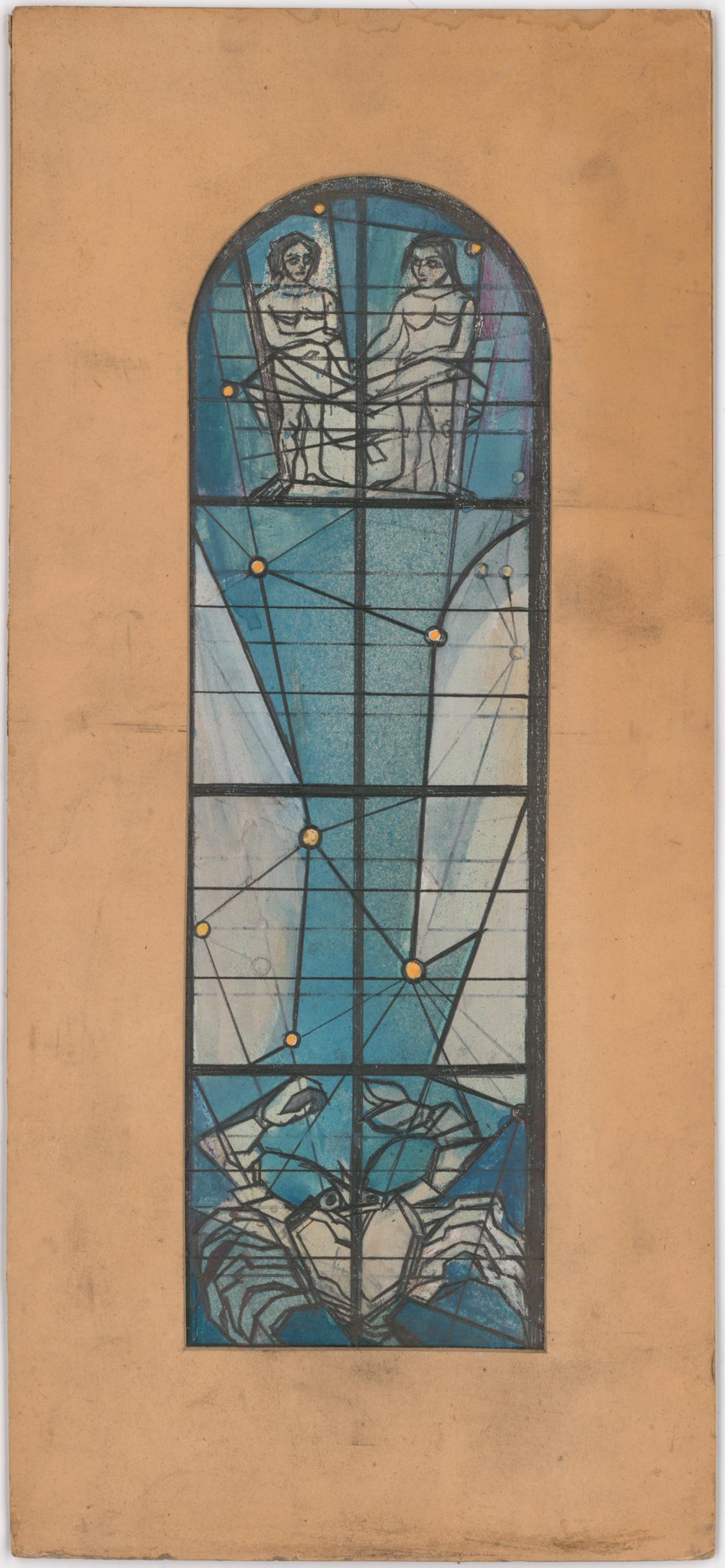 Maquette en couleur pour des vitraux sur le thème de la "carte du ciel" avec deux signes du zodiaque à chaque extrémité. Le Cancer, en bas, les pinces tournées vers le haut, et au sommet les Gémeaux, représentés par un homme et une femme tournés l'un vers l'autre, leur nudité cachée par un grand voile tournant autour d'eux. La composition est traversée par le tracé de leurs constellations sur un fond de ciel bleu.