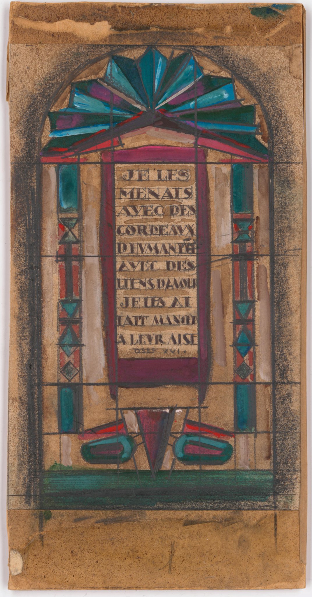 Louis et Marcel pensaient à l'origine réaliser seulement six vitraux avec des prophètes, et deux fenêtres décoratives contenant des prophéties, auxquelles cette maquette correspond. Cette idée est finalement abandonnée en automne 1943, de même que celle de réaliser les figures en camaïeu et non en couleur. Cette maquette correspondant à ce premier projet peut donc être datée entre 1941 (début supposé de la commande, d'après la correspondance échangée entre l'artiste et son frère, le chanoine Poncet) et 1943. Cf: Lettre de Marcel Poncet à Philipp Etter, Président de la Commission fédérale de la Fondation et chef du Département de l’Intérieur, [octobre 1943], Dossier "Vitraux, Eglise Saint-Sigismond, Saint-Maurice, 1941-1947", boîte "VITRAUX II, 1932-1947", fonds Poncet, Vitrocentre Romont.
