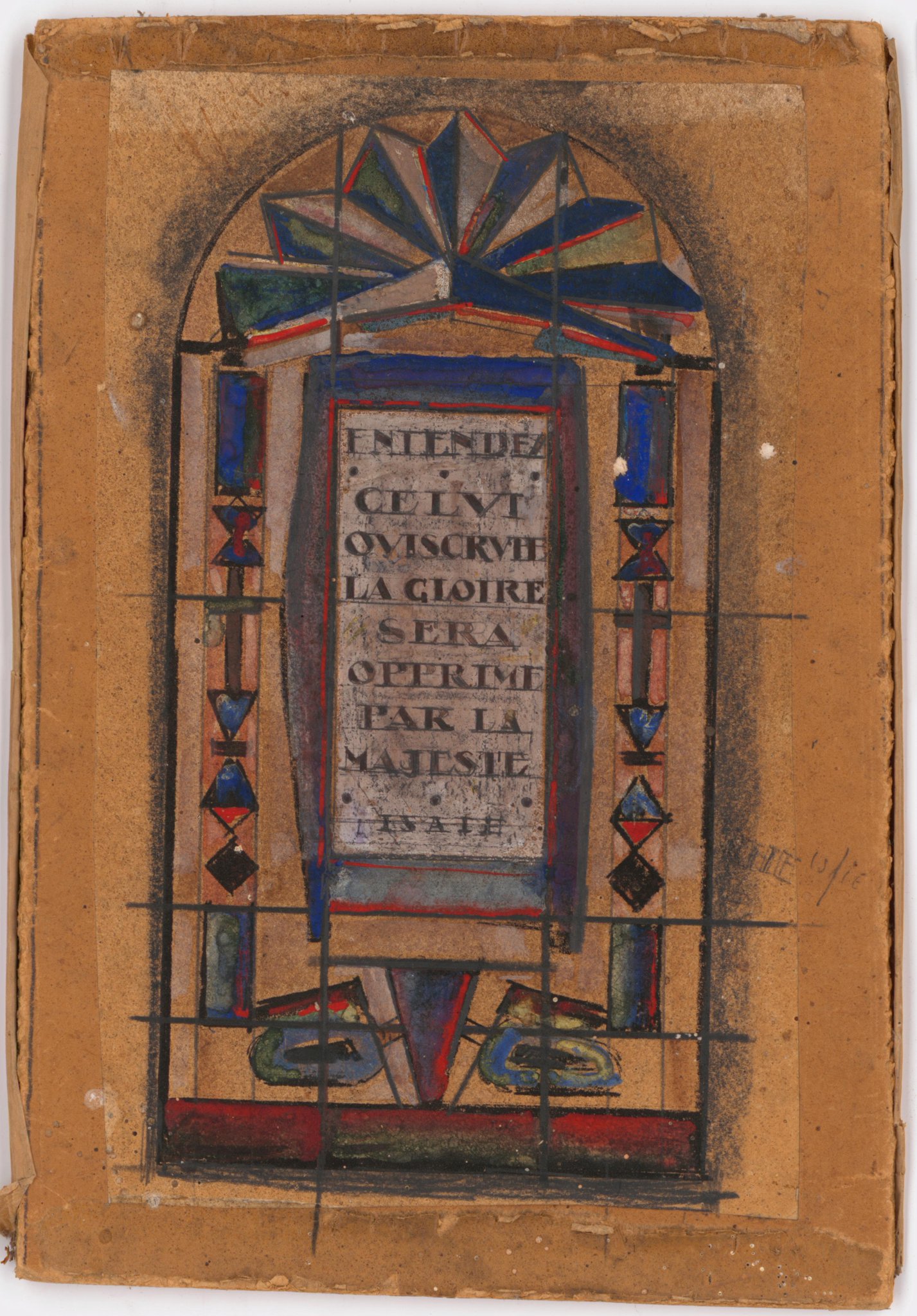 Louis et Marcel pensaient à l'origine réaliser seulement six vitraux avec des prophètes, et deux fenêtres décoratives contenant des prophéties, auxquelles cette maquette correspond. Cette idée est finalement abandonnée en automne 1943, de même que celle de réaliser les figures en camaïeu et non en couleur. Cette maquette correspondant à ce premier projet peut donc être datée entre 1941 (début supposé de la commande, d'après la correspondance échangée entre l'artiste et son frère, le chanoine Poncet) et 1943. Cf: Lettre de Marcel Poncet à Philipp Etter, Président de la Commission fédérale de la Fondation et chef du Département de l’Intérieur, [octobre 1943], Dossier "Vitraux, Eglise Saint-Sigismond, Saint-Maurice, 1941-1947", boîte "VITRAUX II, 1932-1947", fonds Poncet, Vitrocentre Romont.