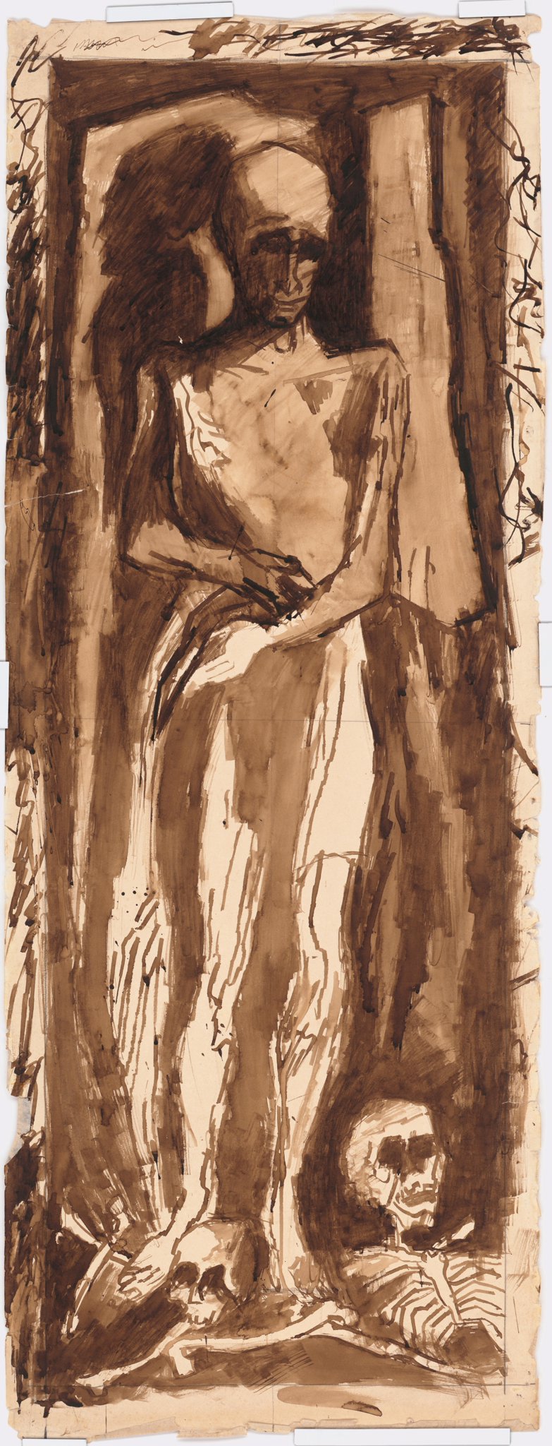 Le prophète Ezéchiel debout, le corps décharné, entouré de crânes jonchant le sol à ses pieds.