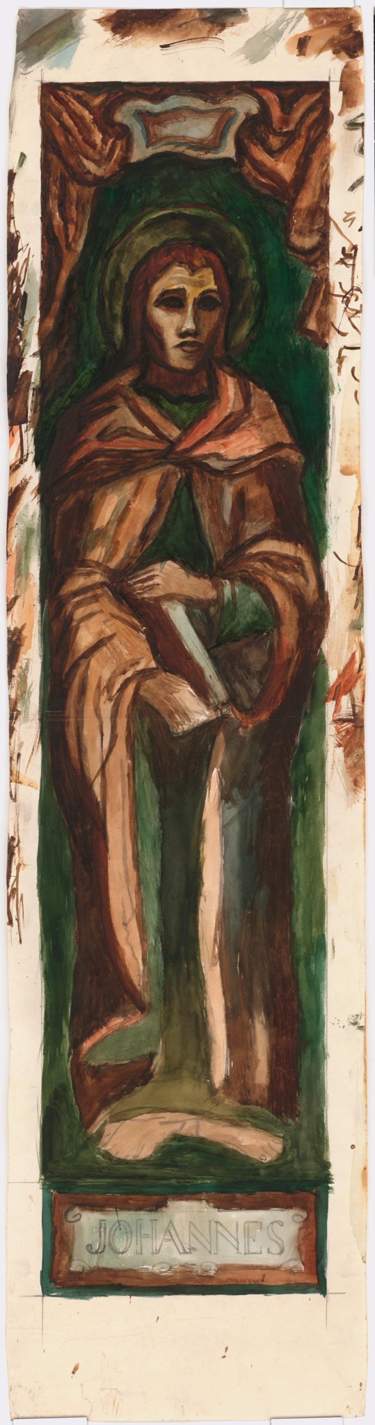 Ce travail préparatoire a été réalisé par Marcel Poncet dans le cadre de la commande de quatre vitraux des Evangélistes pour la Reformierte Kirche de Schlieren (Zurich), réalisés en 1937. Poncet obtient cette commande par l'intermédiaire de l'architecte de l'édifice, Walter Henauer (1880-1975), qu'il a rencontré à l'occasion de ses séjours parisiens. Suite à la pose des vitraux, il propose pour cette même église un projet de carte du ciel (représentations du zodiaque, des planètes et leurs personnifications), qui est refusé par la commission, pour des raisons avant tout financières (REYMOND, 1992, pp. 70, 170 ; "Neue reformierte Kirche in Zürich-Wollishofen und neue Kirche und Renovation der alten Kirche in Schlieren : Architekten W. Henauer & E. Witschi SA, Zürich.", 1938, pp. 297-304).