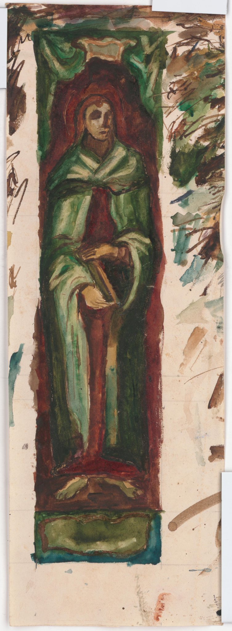 Ce travail préparatoire a été réalisé par Marcel Poncet dans le cadre de la commande de quatre vitraux des Evangélistes pour la Reformierte Kirche de Schlieren (Zurich), réalisés en 1937. Poncet obtient cette commande par l'intermédiaire de l'architecte de l'édifice, Walter Henauer (1880-1975), qu'il a rencontré à l'occasion de ses séjours parisiens. Suite à la pose des vitraux, il propose pour cette même église un projet de carte du ciel (représentations du zodiaque, des planètes et leurs personnifications), qui est refusé par la commission, pour des raisons avant tout financières (REYMOND, 1992, pp. 70, 170 ; "Neue reformierte Kirche in Zürich-Wollishofen und neue Kirche und Renovation der alten Kirche in Schlieren : Architekten W. Henauer & E. Witschi SA, Zürich.", 1938, pp. 297-304).