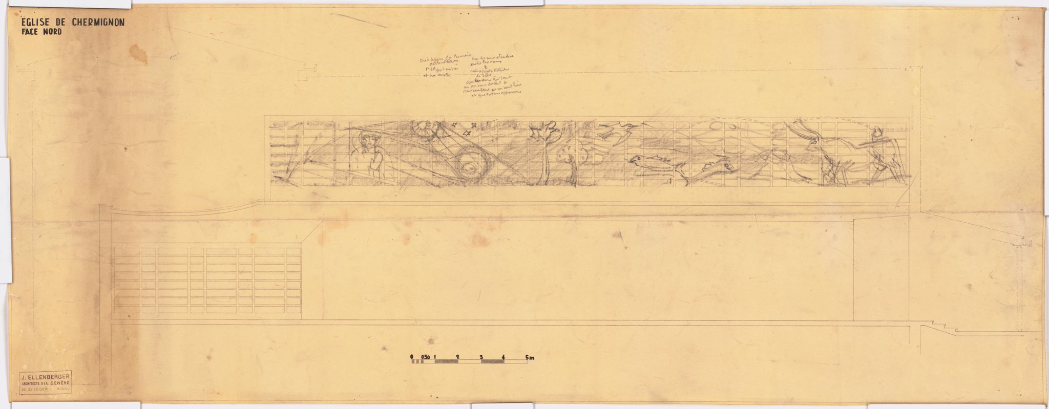 Esquisse pour la "Création du monde" de Chermignon sur un plan des vitrages de la façade nord de la nef : Dieu à l’extrême gauche, levant la main et séparant le soleil de la lune, puis créant les végétaux et les créatures volantes, puis aquatiques, et enfin terrestres, représentées par un taureau, dans un style rappelant les animaux des peintures rupestres préhistoriques