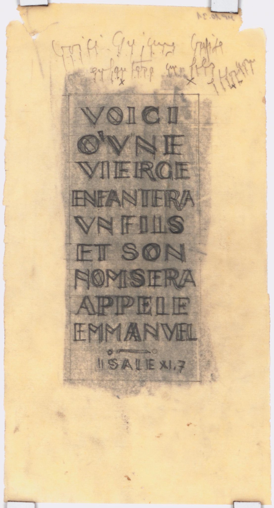 [Au centre :] VOICI / Q'UNE / VIERGE / ENFANTERA / UN FILS / ET SON / NOM SERA / APPELE / EMMANUEL / ISAIE XI.7