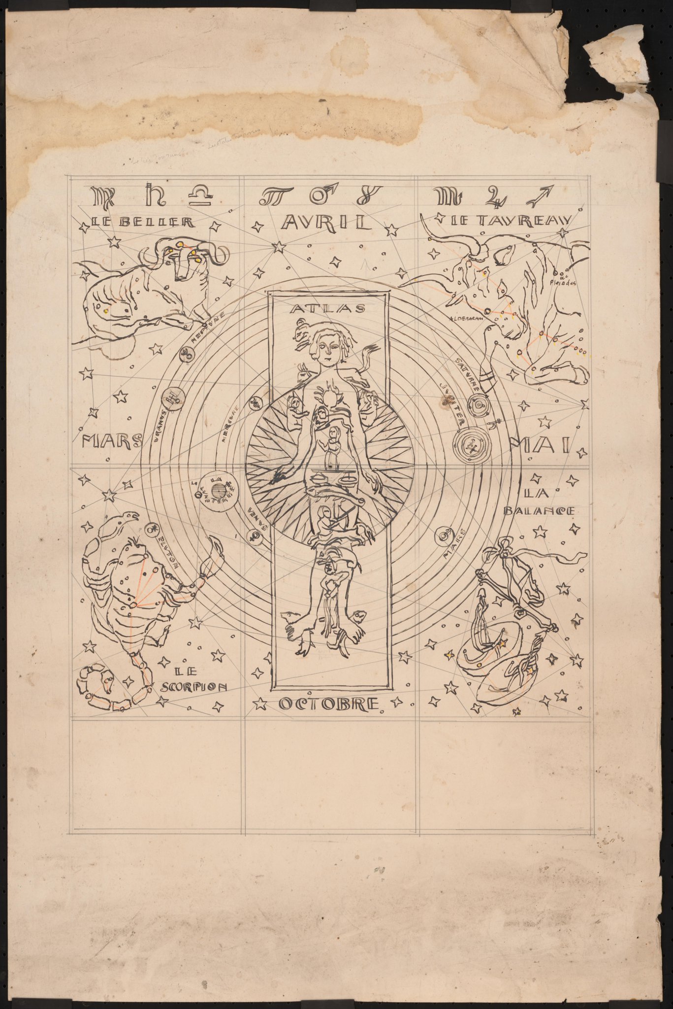 Projet pour les vitraux sur le thème de la "carte du ciel" : homme zodiaque (avec la personnification des douze signes répartis sur l'ensemble de son corps) et dont le centre du corps rayonne comme une rose des vents, inscrit dans un rectangle lui-même entouré de plusieurs cercles concentriques représentant le système solaire avec les planètes, et entouré aux angles de quatre personnifications des signes du zodiaque (le Bélier, le Taureau, le Scorpion et la Balance) représentés parmi un ciel étoilé. Sur la frise supérieure, les symboles des planètes sont représentés.