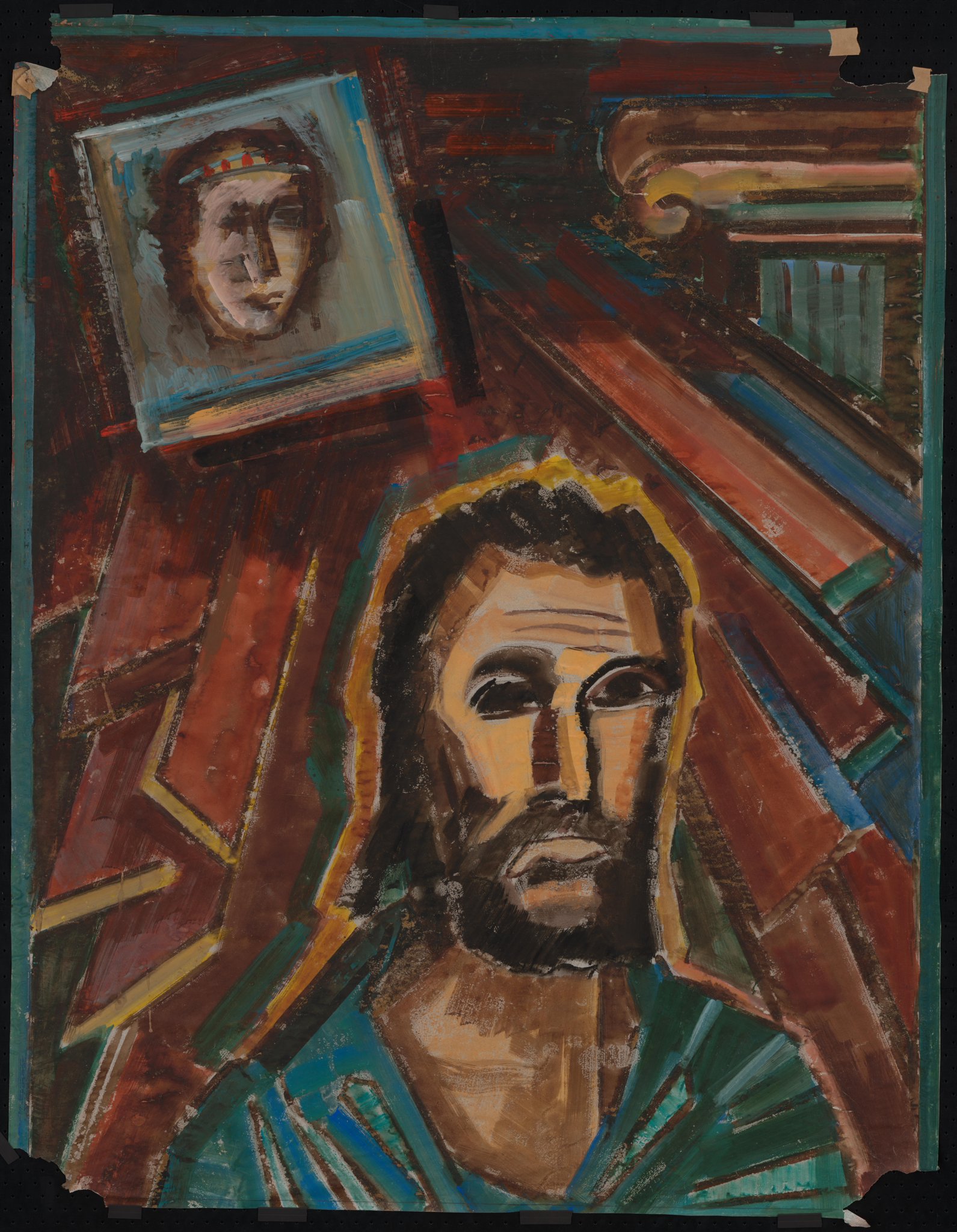 Ce carton présente quelques différences avec les vitraux, notamment dans le fond, qui est ici orné d'une colonne et d'un portrait, idée qui n'est finalement pas retenue.