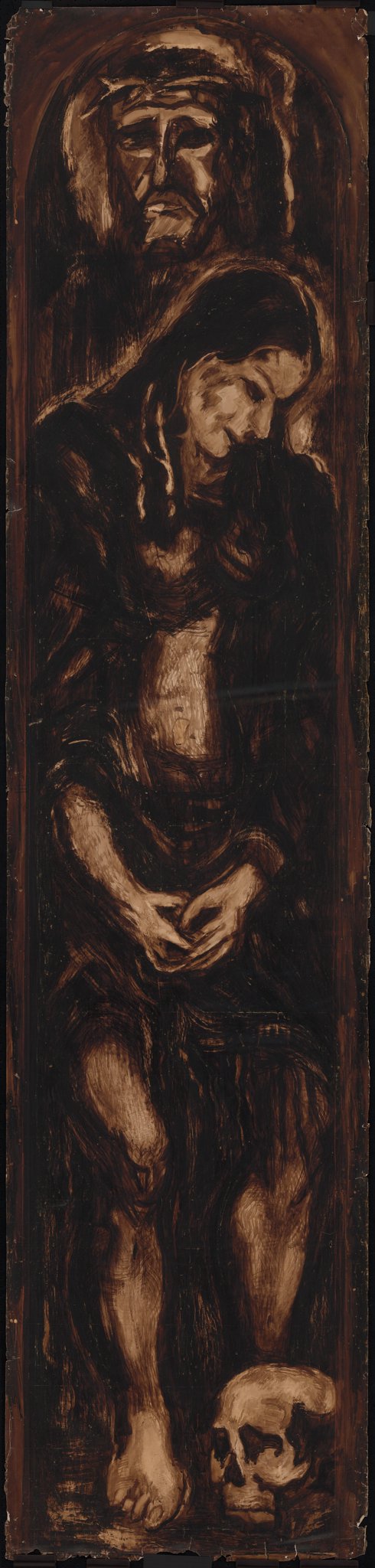 Il s'agit d'un des cartons définitifs pour les vitraux de Gstaad, dans lesquels Poncet abandonne la couleur pour travailler dans des camaïeux de bruns et noirs qu'il traduira dans les vitraux par une abondante grisaille, et opte pour des figures de saints torturés et pathétiques. On ignore cependant pourquoi Poncet modifie d'une manière aussi radicale son projet, puisque les premières esquisses et cartons étaient colorés et les saints représentés de manière plus traditionnelle, d'autant qu'il ne semble pas en avoir averti les commanditaires, très choqués au moment de leur pose.