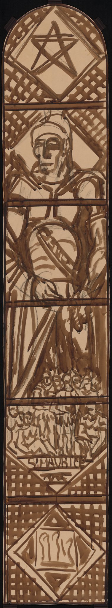 Saint Maurice en soldat, debout en pied, protégeant une foule de son manteau, dans laquelle on peut identifier des femmes et des soldats. Le saint est surplombé d'une étoile, et un losange orné de motifs fait figure de socle.