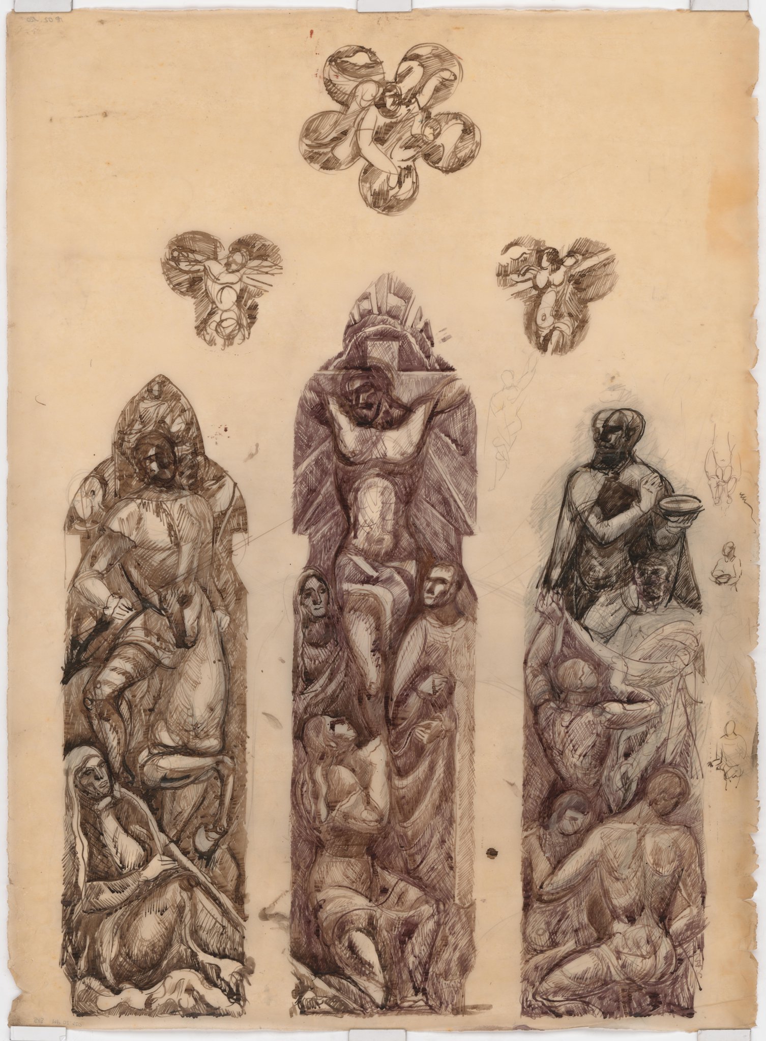 Esquisse pour l'ensemble du vitrail de la Crucifixion : sur la lancette centrale, le Christ en croix, entouré de Marie et Jean, et Marie-Madeleine au pied de la croix. Sur la lancette de gauche : le porte-lance à cheval, habillé en soldat et à ses pieds, une femme assise se tenant la tête dans la main. Sur la lancette de droite, le porte-éponge est représenté au sommet. Un soldat semble retenir un homme de dos en dessous, et dans le bas, deux hommes sont assis, celui du premier plan de dos.