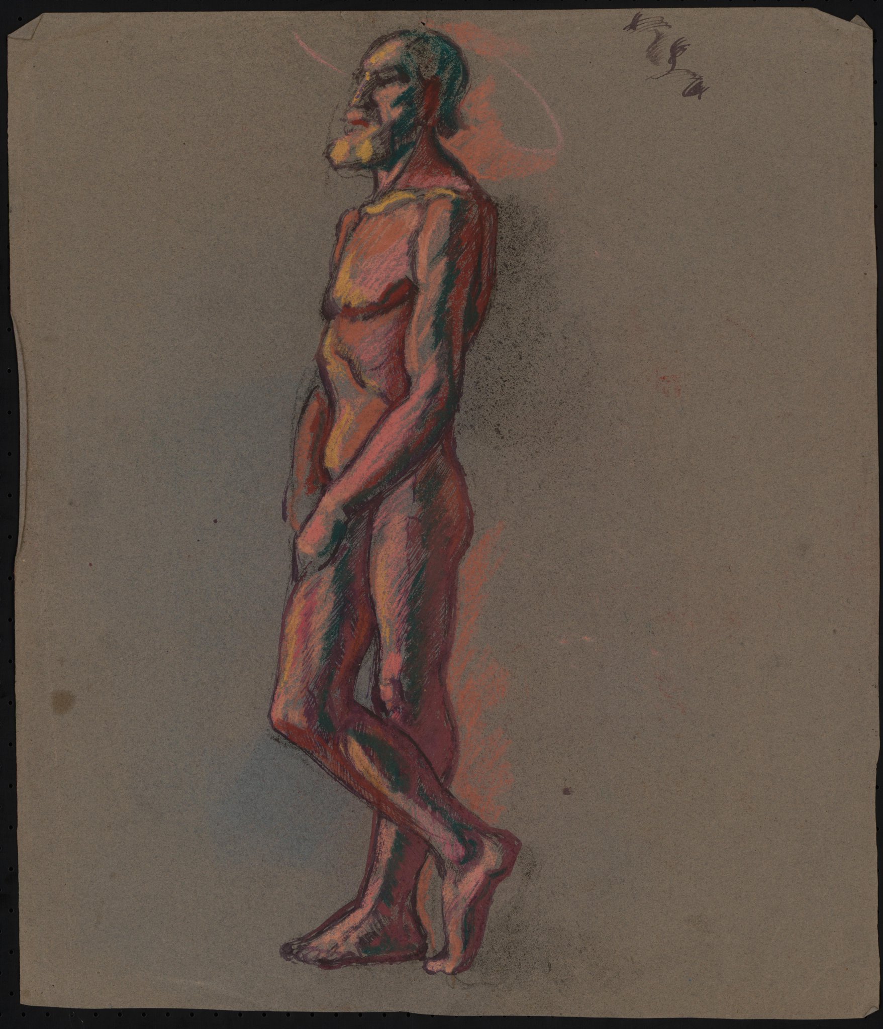 Saint Luc ou saint Jean debout, barbu et tourné de profil sur la gauche, une jambe croisée devant l'autre, nu.